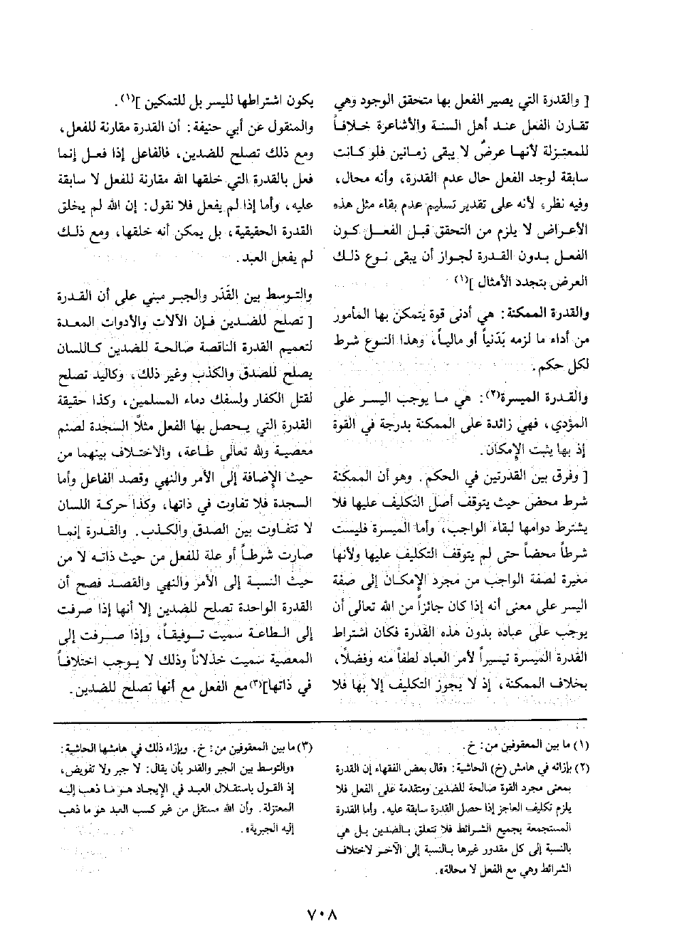 وَالْمَنْقُول عَن أبي حنيفَة: أَن الْقُدْرَة مُقَارنَة للْفِعْل، وَمَعَ ذَلِك تصلح للضدين، فالفاعل إِذا فعل إِنَّمَا فعل بِالْقُدْرَةِ الَّتِي خلقهَا الله مُقَارنَة للْفِعْل لَا سَابِقَة عَلَيْهِ، وَأما إِذا لم يفعل فَلَا نقُول: إِن الله لم يخلق الْقُدْرَة الْحَقِيقِيَّة، بل يُمكن أَنه خلقهَا، وَمَعَ ذَلِك لم يفعل العَبْد