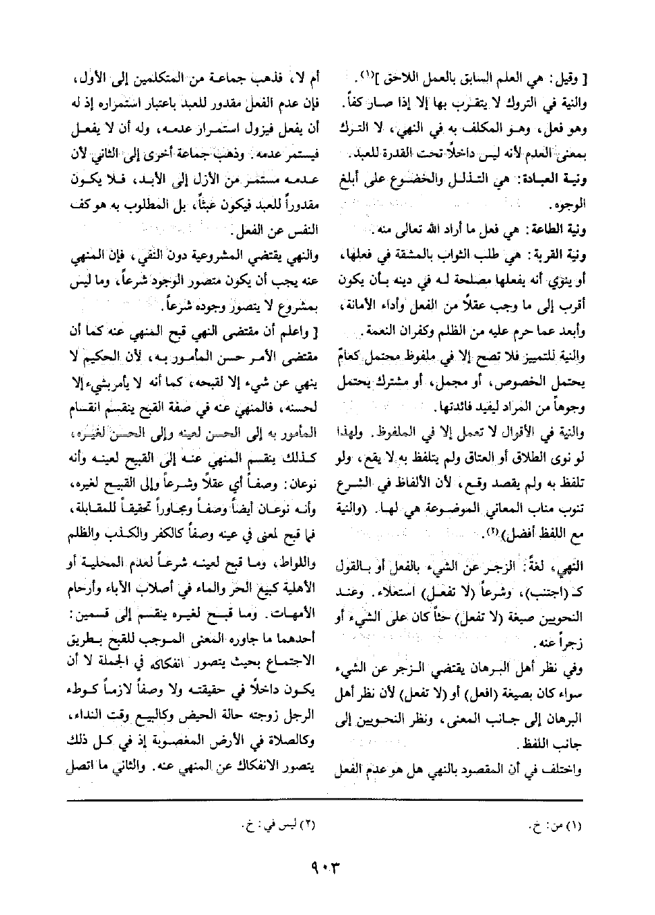 أم لَا، فَذهب جمَاعَة من الْمُتَكَلِّمين إِلَى الأول، فَإِن عدم الْفِعْل مَقْدُور للْعَبد بِاعْتِبَار استمراره إِذْ لَهُ أَن يفعل فيزول اسْتِمْرَار عَدمه، وَله أَن لَا يفعل فيستمر عَدمه. وَذهب جمَاعَة أُخْرَى إِلَى الثَّانِي لِأَن عَدمه مُسْتَمر فِي الْأَزَل إِلَى الْأَبَد، فَلَا يكون مَقْدُورًا للْعَبد عَبَثا، بل الْمَطْلُوب بِهِ هُوَ كف النَّفس عَن الْفِعْل.
