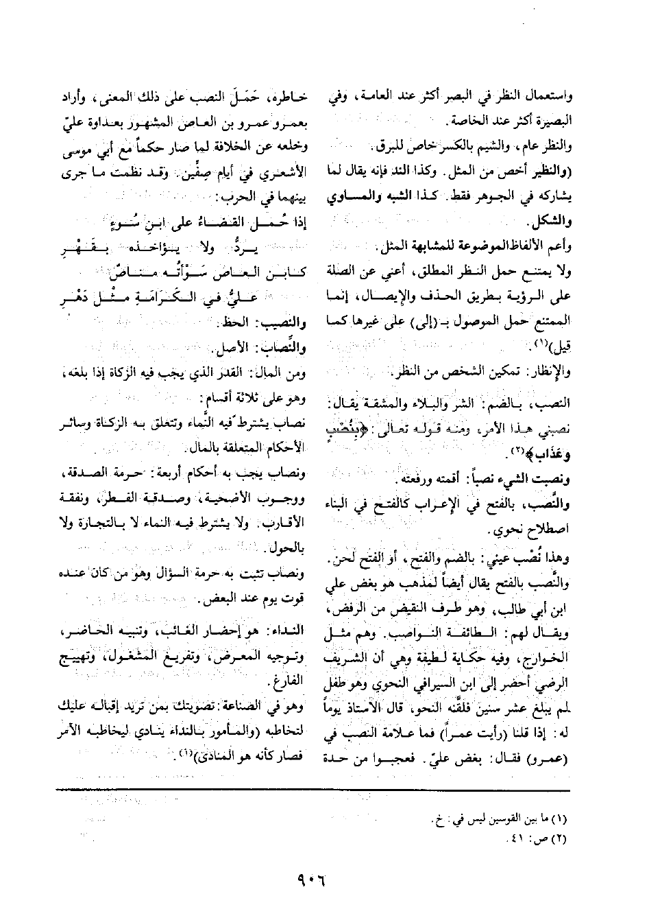 والنَّصب بِالْفَتْح يُقَال أَيْضا لمَذْهَب هُوَ بغض عَليّ ابْن أبي طَالب، وَهُوَ طرف النقيض من الرَّفْض، وَيُقَال لَهُم: الطَّائِفَة النواصب. وهم مثل الْخَوَارِج، وَفِيه حِكَايَة لَطِيفَة وَهِي أَن الشريف الرضي أحضر إِلَى ابْن السيرافي النَّحْوِيّ وَهُوَ طِفْل لم يبلغ عشر سِنِين فلقَّنه النَّحْو، قَالَ الْأُسْتَاذ يَوْمًا لَهُ: إِذا قُلْنَا (رَأَيْت عمرا) فَمَا علاقَة النصب فِي (عَمْرو) فَقَالَ: بغض عليّ. فعجبوا من حِدة