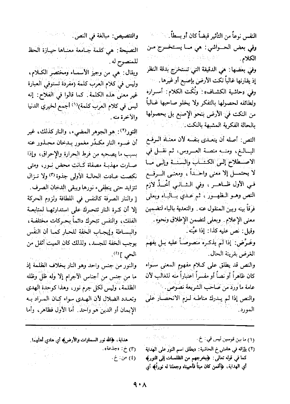 وَالنَّص قد يُطلق على كَلَام مَفْهُوم الْمَعْنى سَوَاء كَانَ ظَاهرا أَو نصا أَو مُفَسرًا اعْتِبَارا مِنْهُ للْغَالِب لِأَن عَامَّة مَا ورد من صَاحب الشَّرِيعَة نُصُوص.