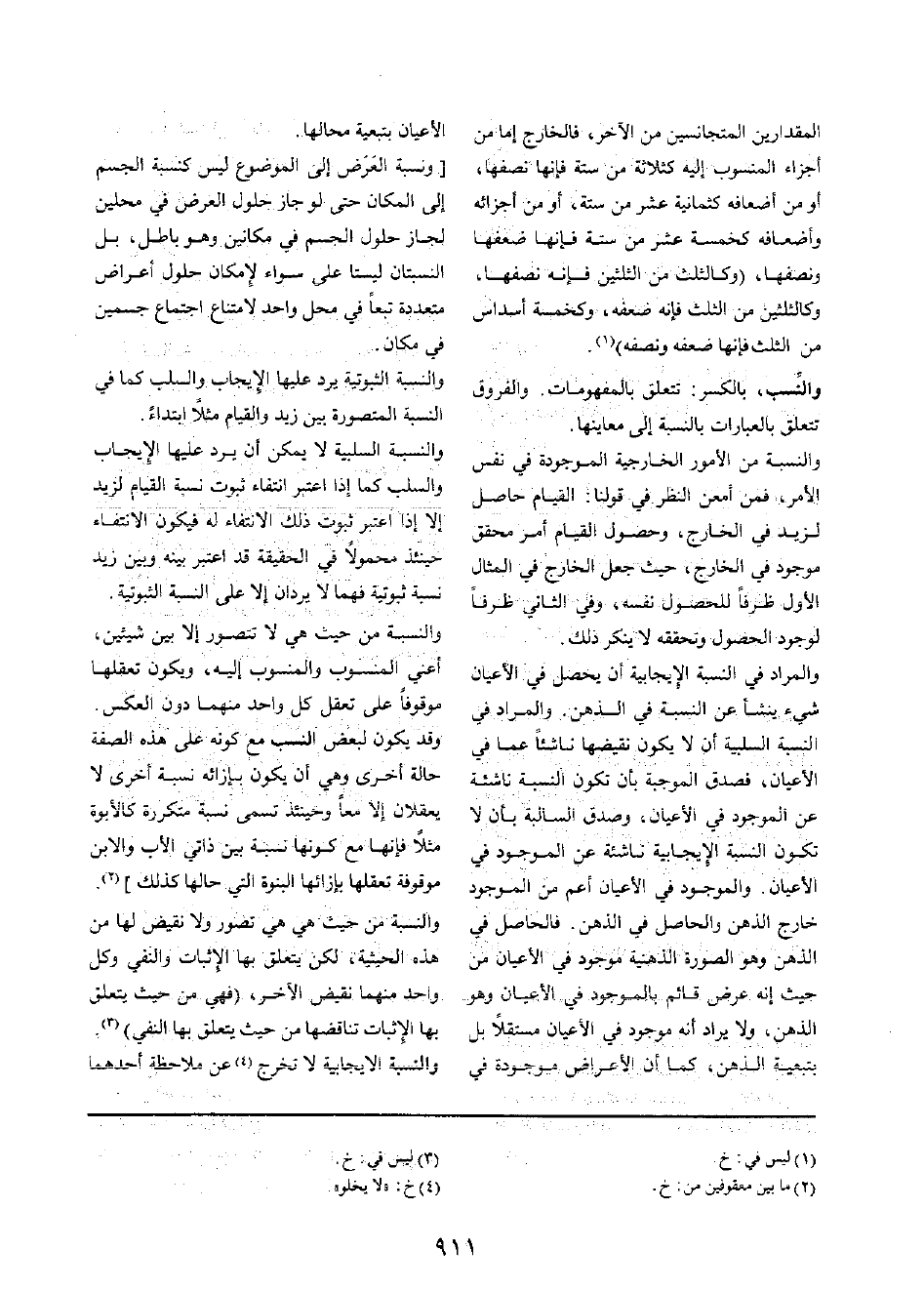 وَالنِّسْبَة فِي الْأُمُور الخارجية الْمَوْجُودَة فِي نفس الْأَمر، فَمن أمعن النّظر فِي قَوْلنَا: الْقيام حَاصِل لزيد فِي الْخَارِج، وَحُصُول الْقيام أَمر مُحَقّق مَوْجُود فِي الْخَارِج، حَيْثُ جعل الْخَارِج فِي الْمِثَال الأول ظرفا للحصول نَفسه، وَفِي الثَّانِي ظرفا لوُجُود الْحَاصِل وتحققه لَا يُنكر ذَلِك.