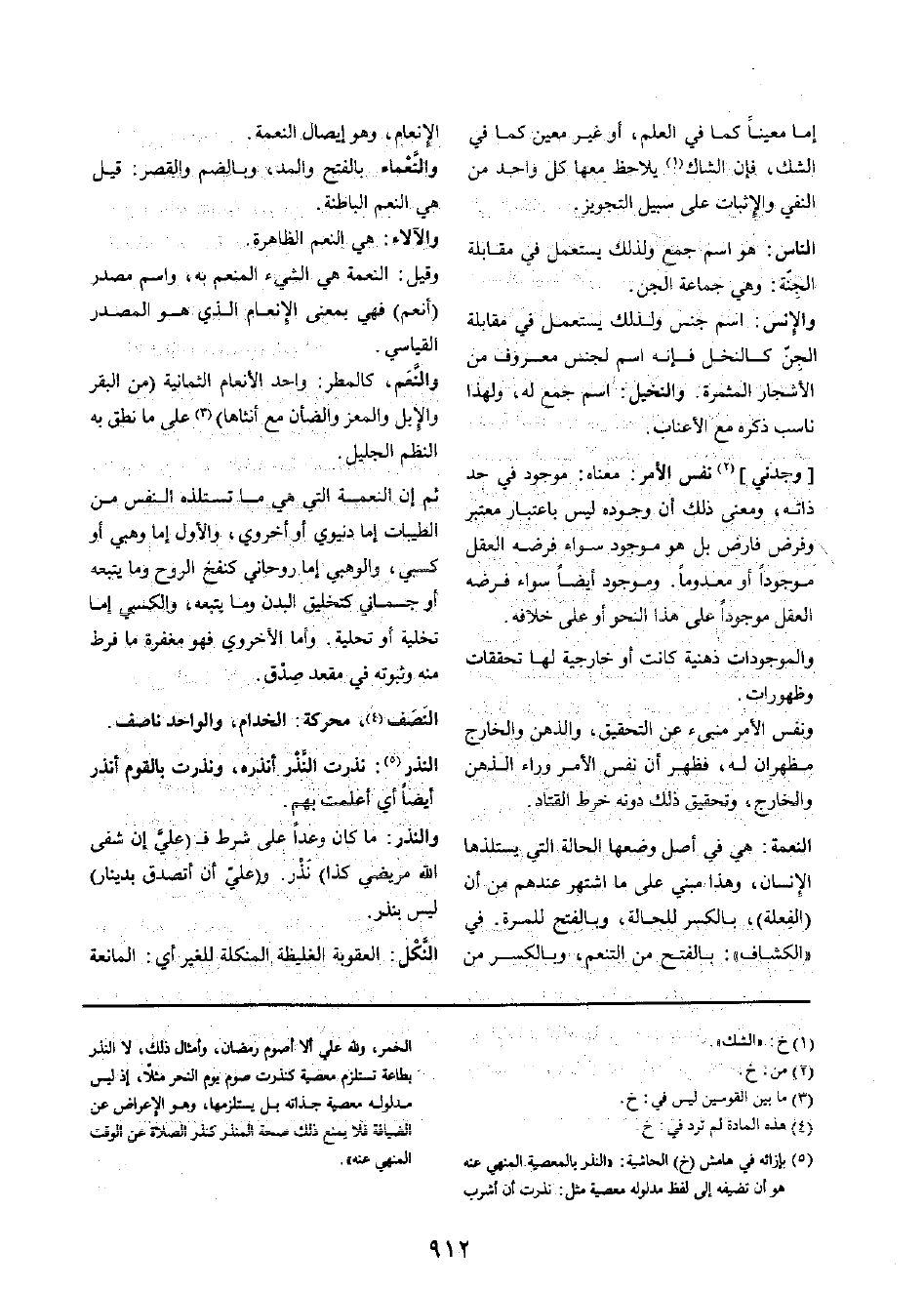 ثمَّ إِن النِّعْمَة الَّتِي هِيَ مَا تستلذه النَّفس من الطَّيِّبَات إِمَّا دُنْيَوِيّ أَو أخروي، وَالْأول إِمَّا وهبي أَو كسبي، والوهبي إِمَّا روحاني كنفخ الرّوح وَمَا يتبعهُ أَو جسماني كتخليق الْبدن وَمَا يتبعهُ، والكسبي إِمَّا تخيلة أَو تحلية. وَأما الأخروي فَهُوَ مغْفرَة مَا فرط مِنْهُ وثبوته فِي مقْعد صِدْق.