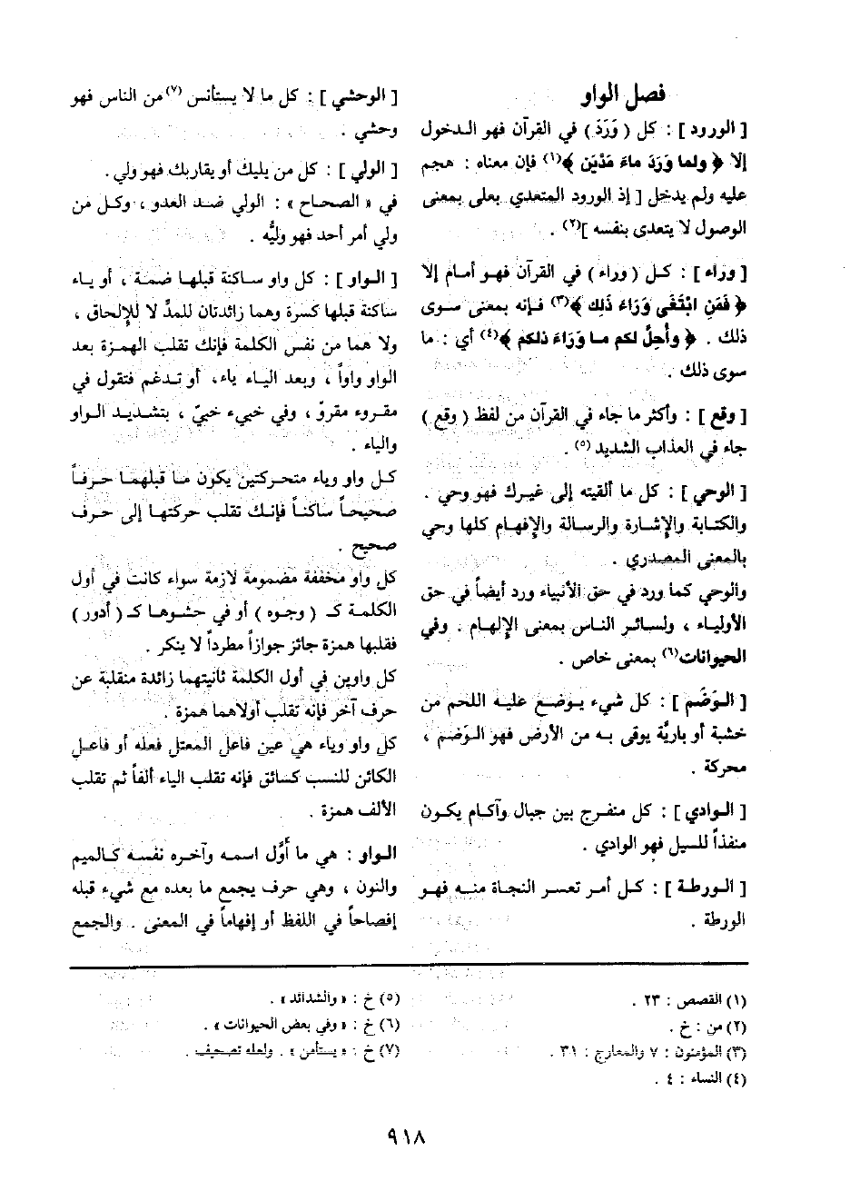 [الْوُرُود] : كل (وَرَدَ) فِي الْقُرْآن فَهُوَ الدُّخُول إِلَّا {وَلما ورد مَاء مَدين} فَإِن مَعْنَاهُ: هجم عَلَيْهِ وَلم يدْخل [إِذْ الْوُرُود المعتدي بعلى بِمَعْنى الْوُصُول لَا يتَعَدَّى بِنَفسِهِ] .