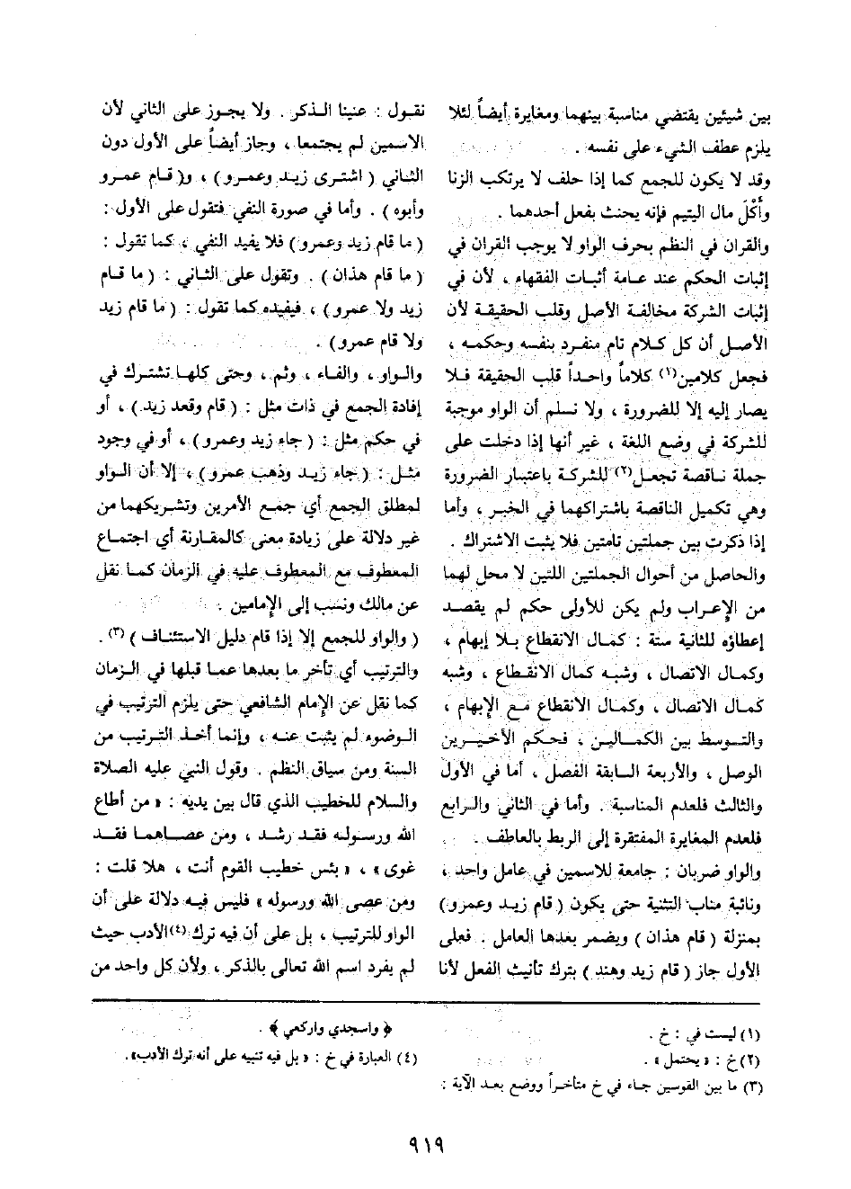 وَالْوَاو، وَالْفَاء، وَثمّ، وَحَتَّى كلهَا تشترك فِي إِفَادَة الْجمع فِي ذَات مثل: (قَامَ وَقعد زيد) ، أَو فِي حكم مثل: (جَاءَ زيد وَعَمْرو) ، أَو فِي وجود مثل: (جَاءَ زيد وَذهب عَمْرو) ، إِلَّا أَن الْوَاو لمُطلق الْجمع أَي جمع الْأَمريْنِ وتشريكهما من غير دلَالَة على زِيَادَة معنى كالمقارنة أَي اجْتِمَاع الْمَعْطُوف مَعَ الْمَعْطُوف عَلَيْهِ فِي الزَّمَان كَمَا نقل عَن مَالك وَنسب إِلَى الْإِمَامَيْنِ.