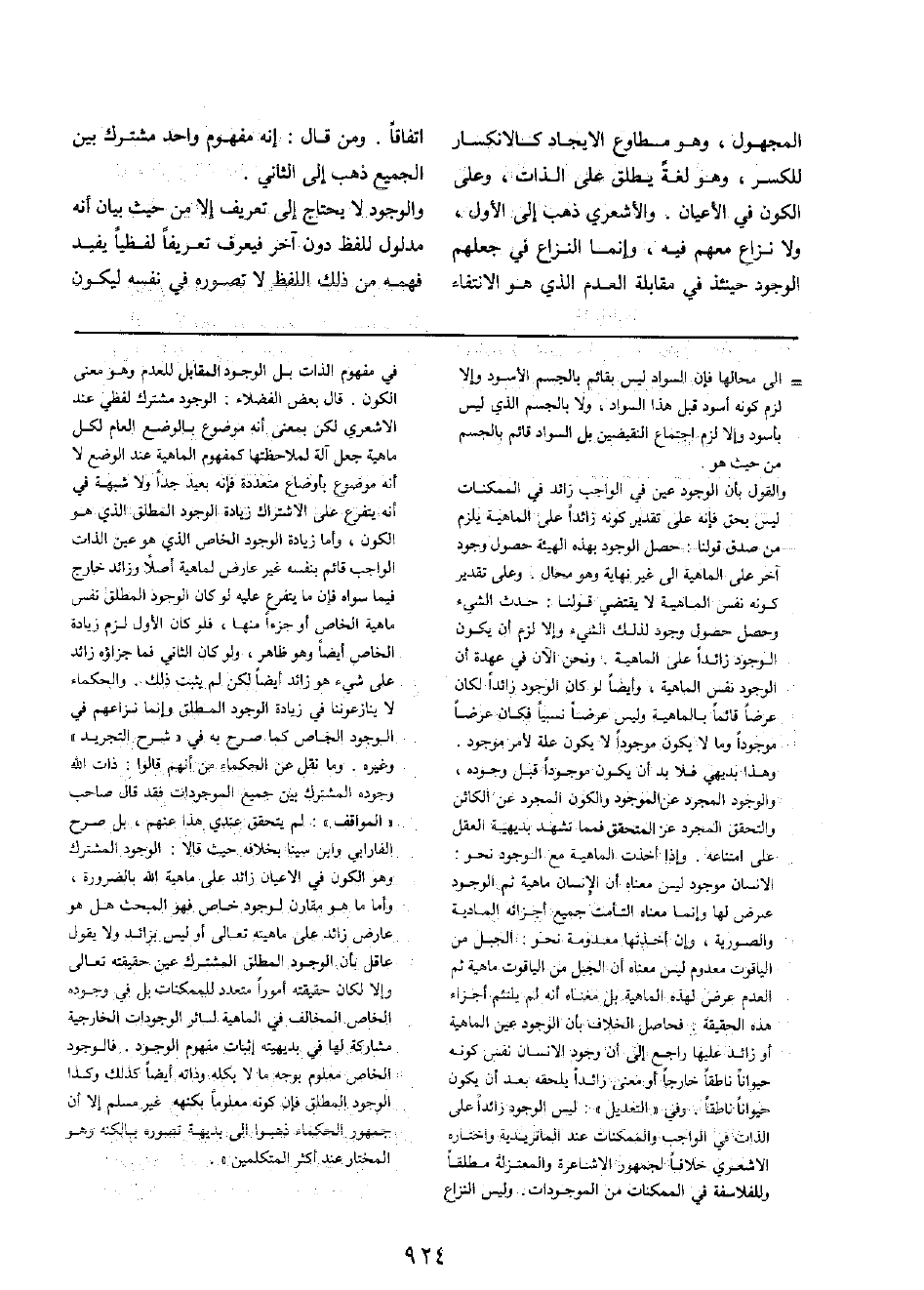 الْمَجْهُول، وَهُوَ مُطَاوع الايجاد كالانكسار للكسر، وَهُوَ لُغَة يُطلق على الذَّات، وعَلى الْكَوْن فِي الْأَعْيَان. والأشعري ذهب إِلَى الأول، وَلَا نزاع مَعَهم فِيهِ، وَإِنَّمَا النزاع فِي جعلهم الْوُجُود حِينَئِذٍ فِي مُقَابلَة الْعَدَم الَّذِي هُوَ الانتفاء