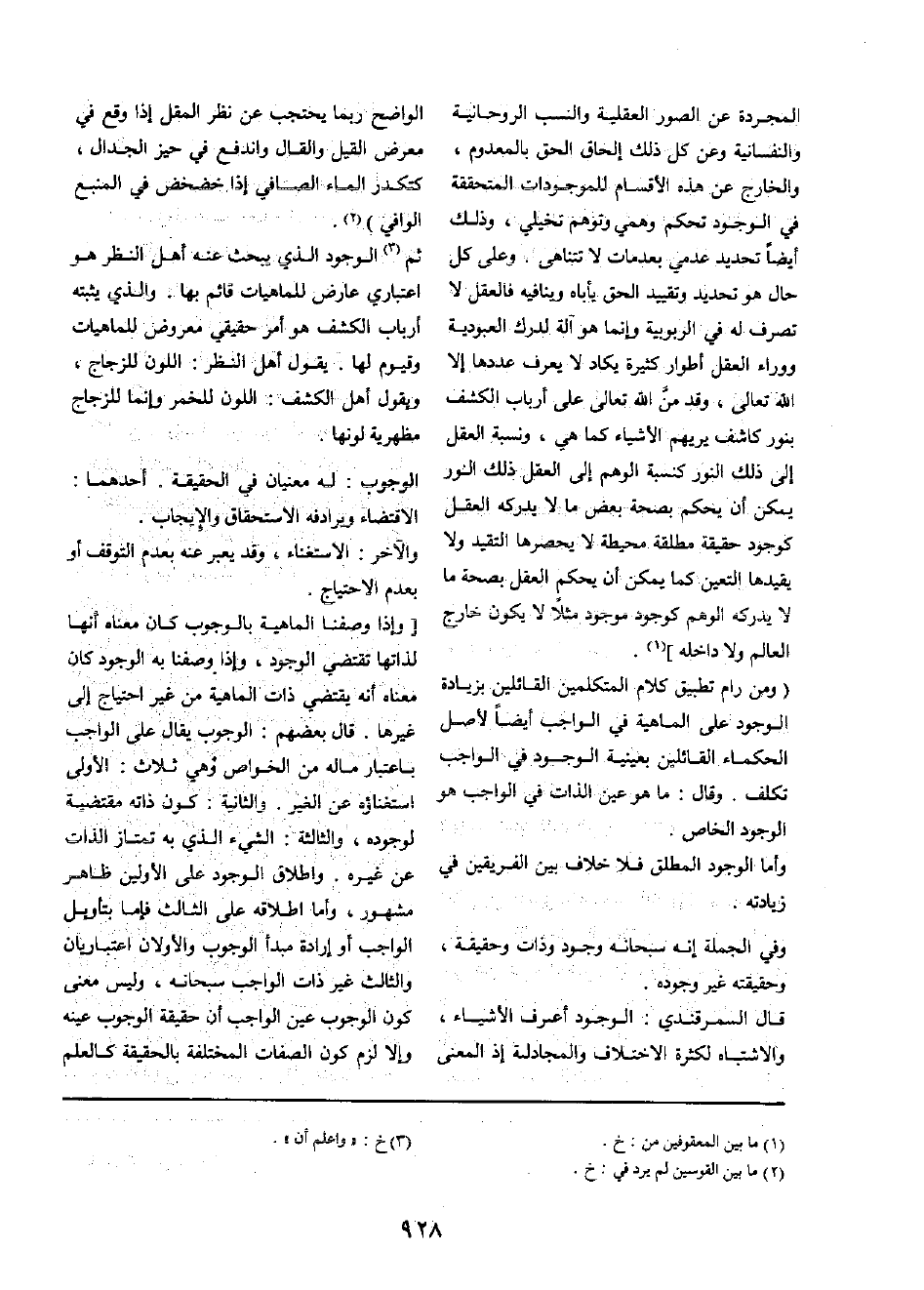 (وَمن رام تطبيق كَلَام الْمُتَكَلِّمين الْقَائِلين بِزِيَادَة الْوُجُود على الْمَاهِيّة فِي الْوَاجِب أَيْضا لأصل الْحُكَمَاء الْقَائِلين بعينية الْوُجُود فِي الْوَاجِب تكلّف. وَقَالَ: مَا هُوَ عين الذَّات فِي الْوَاجِب هُوَ الْوُجُود الْخَاص.