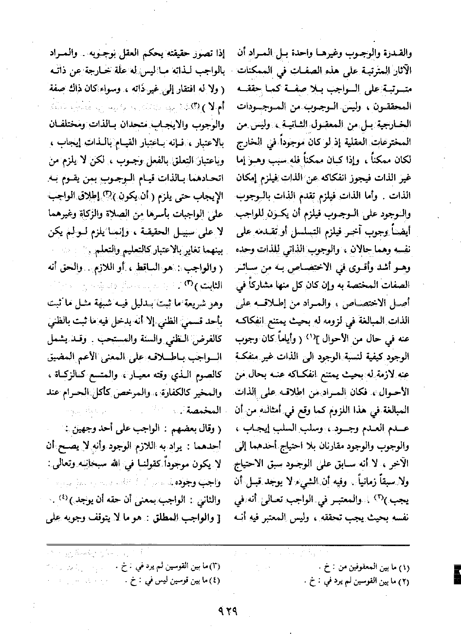 وَالْقُدْرَة وَالْوُجُوب وَغَيرهَا وَاحِدَة بل المُرَاد أَن الْآثَار المترتبة على هَذِه الصِّفَات فِي الممكنات مترتبة على الْوَاجِب بِلَا صفة كَمَا حَقَّقَهُ الْمُحَقِّقُونَ، وَلَيْسَ الْوُجُوب من الموجودات الخارجية بل من الْمَعْقُول الثَّانِيَة، وَلَيْسَ من المخترعات الْعَقْلِيَّة إِذْ لَو كَانَ مَوْجُودا فِي الْخَارِج لَكَانَ مُمكنا، وَإِذا كَانَ مُمكنا فَلهُ سَبَب وَهُوَ إِمَّا غير الذَّات فَيجوز انفكاكه عَن الذَّات فَيلْزم إِمْكَان الذَّات. وَأما الذَّات فَيلْزم تقدم الذَّات بِالْوُجُوب والوجود على الْوُجُوب فَيلْزم أَن يكون للْوَاجِب أَيْضا وجوب آخر فَيلْزم التسلسل أَو تقدمه على نَفسه وهما حالان، وَالْوُجُوب الذاتي للذات وَحده وَهُوَ أَشد وَأقوى فِي الِاخْتِصَاص بِهِ من سَائِر الصِّفَات المختصة بِهِ وَإِن كَانَ كل مِنْهَا مشاركاً فِي أصل الِاخْتِصَاص، وَالْمرَاد من إِطْلَاقه على الذَّات الْمُبَالغَة فِي لُزُومه لَهُ بِحَيْثُ يمْتَنع انفكاكه عَنهُ فِي حَال من الْأَحْوَال] (وأياماً كَانَ وجوب الْوُجُود كَيْفيَّة لنسبة الْوُجُود إِلَى الذَّات غير منفكة عَنهُ لَازِمَة لَهُ بِحَيْثُ يمْتَنع انفكاكه عَنهُ بِحَال من الْأَحْوَال، فَكَانَ المُرَاد من إِطْلَاقه على الذَّات الْمُبَالغَة فِي هَذَا اللُّزُوم كَمَا وَقع فِي أَمْثَاله من أَن عدم الْعَدَم وجود، وسلب السَّلب إِيجَاب، وَالْوُجُوب والوجود مقارنان بِلَا احْتِيَاج أَحدهمَا إِلَى الآخر، لَا أَنه سَابق على الْوُجُود سبق الِاحْتِيَاج وَلَا سبقاً زمانياً. وَفِيه أَن الشَّيْء لَا يوحد قبل أَن يجب) . وَالْمُعْتَبر فِي الْوَاجِب تَعَالَى أَنه فِي نَفسه بِحَيْثُ يجب تحَققه، وَلَيْسَ الْمُعْتَبر فِيهِ أَنه