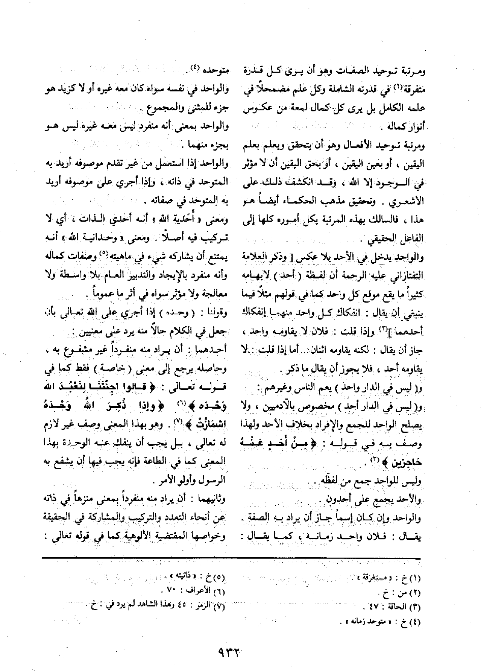 أَحدهمَا: أَن يُرَاد مِنْهُ مُنْفَردا غير مشفوع بِهِ، وَحَاصِله يرجع إِلَى معنى (خَاصَّة) فَقَط كَمَا فِي قَوْله تَعَالَى: {قَالُوا أجئتنا لنعبد الله وَحده} {وَإِذا ذكر الله وَحده اشمأزت} . وَهُوَ بِهَذَا الْمَعْنى وصف غير لَازم لَهُ تَعَالَى، بل يجب أَن يَنْفَكّ عَنهُ الْوحدَة بِهَذَا الْمَعْنى كَمَا فِي الطَّاعَة فَإِنَّهُ يجب فِيهَا أَن يشفع بِهِ الرَّسُول وأولو الْأَمر.