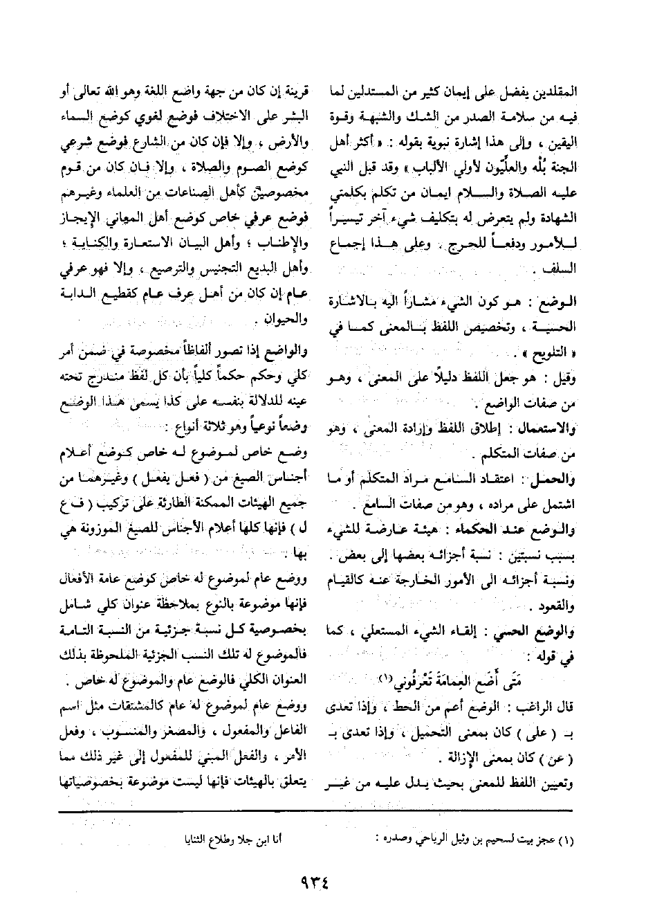 قرينَة إِن كَانَ من جِهَة وَاضع اللُّغَة وَهُوَ الله تَعَالَى أَو الْبشر على الِاخْتِلَاف فَوضع لغَوِيّ كوضع السَّمَاء وَالْأَرْض، وَإِلَّا فَإِن كَانَ من الشَّارِع فَوضع شَرْعِي كوضع الصَّوْم وَالصَّلَاة، وَإِلَّا فَإِن كَانَ من قوم مخصوصين كَأَهل الصناعات من الْعلمَاء وَغَيرهم فَوضع عرفي خَاص كوضع أهل الْمعَانِي والإيجاز والإطناب؛ وَأهل الْبَيَان الِاسْتِعَارَة وَالْكِنَايَة؛ وَأهل البديع التَّجْنِيس والترصيع، وَإِلَّا فَهُوَ عرفي عَام إِن كَانَ من أهل عرف عَام كقطيع الدَّابَّة وَالْحَيَوَان.