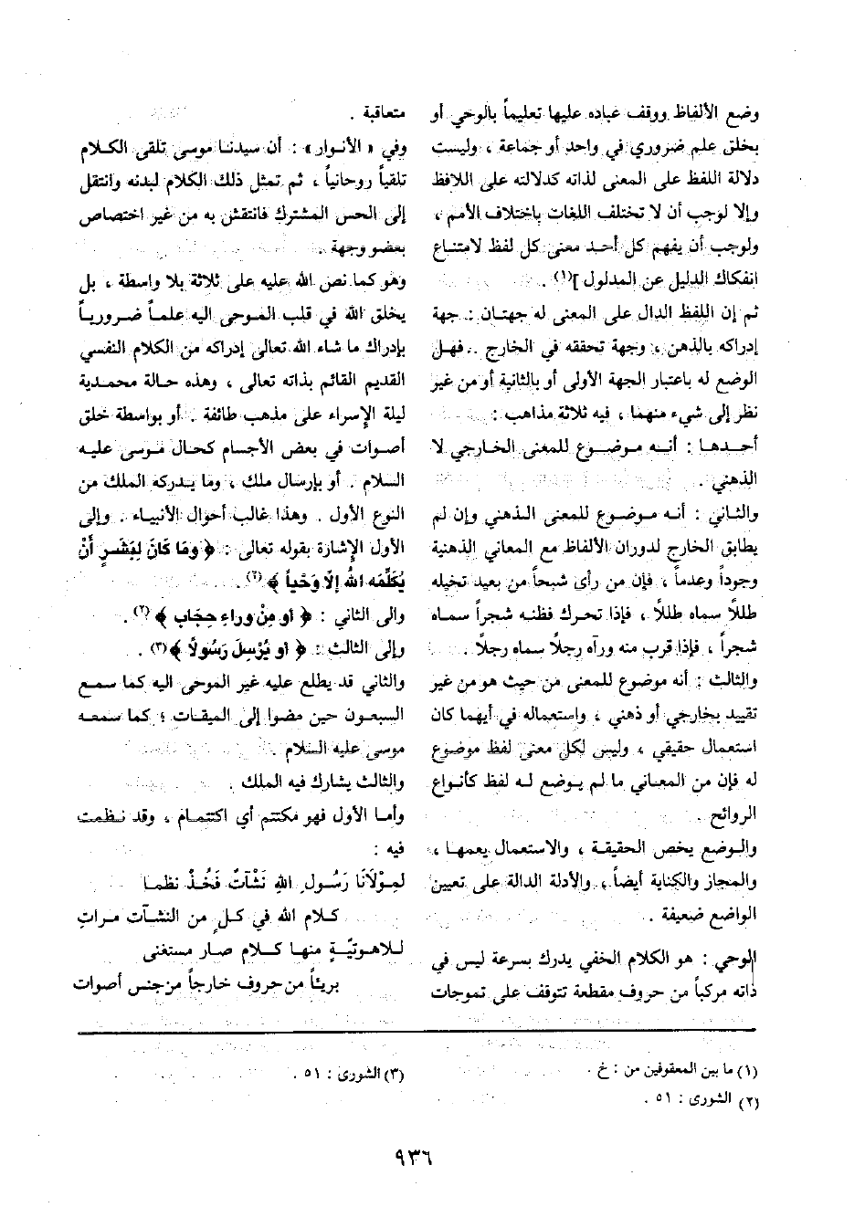 وَهُوَ كَمَا نَص الله عَلَيْهِ على ثَلَاثَة بِلَا وَاسِطَة، بل يخلق الله فِي قلب الموحى إِلَيْهِ علما ضَرُورِيًّا بِإِدْرَاك مَا شَاءَ الله تَعَالَى إِدْرَاكه من الْكَلَام النَّفْسِيّ الْقَدِيم الْقَائِم بِذَاتِهِ تَعَالَى، وَهَذِه حَالَة محمدية لَيْلَة الْإِسْرَاء على مَذْهَب طَائِفَة. أَو بِوَاسِطَة خلق أصوات فِي بعض الْأَجْسَام كَحال مُوسَى عَلَيْهِ السَّلَام. أَو بإرسال ملك، وَمَا يُدْرِكهُ الْملك من النَّوْع الأول. وَهَذَا غَالب أَحْوَال الْأَنْبِيَاء. وَإِلَى الأول الْإِشَارَة بقوله تَعَالَى: {وَمَا كَانَ لبشر أَن يكلمهُ الله إِلَّا وَحيا} .