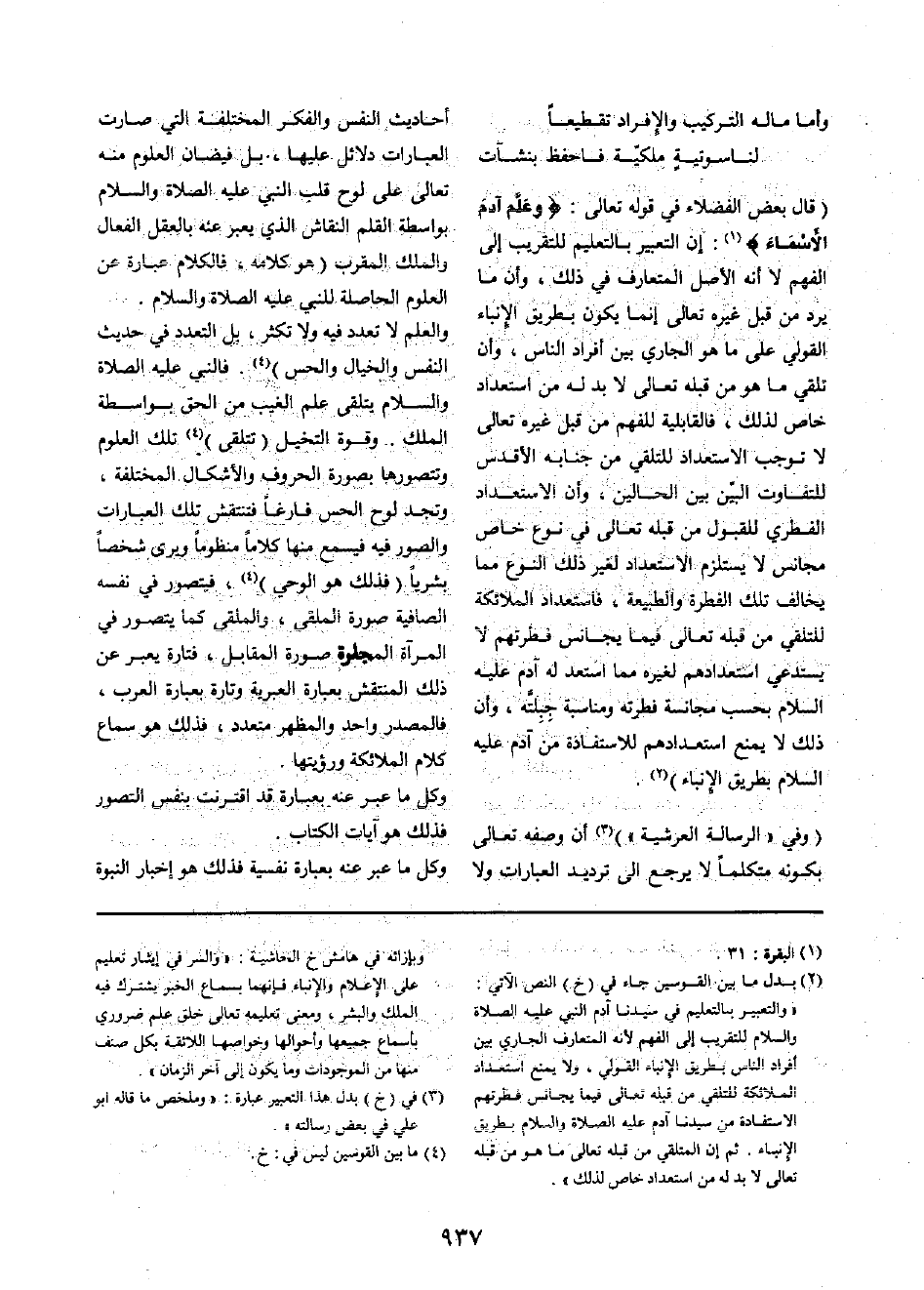 (قَالَ بعض الْفُضَلَاء فِي قَوْله تَعَالَى: {وَعلم آدم الْأَسْمَاء} : إِن التَّعْبِير بالتعليم للتقريب إِلَى الْفَهم لَا أَنه الأَصْل الْمُتَعَارف فِي ذَلِك، وَأَن مَا يرد من قبل غَيره تَعَالَى إِنَّمَا يكون بطرِيق الإنباء القولي على مَا هُوَ الْجَارِي بَين أَفْرَاد النَّاس، وَأَن تلقي مَا هُوَ من قبله تَعَالَى لَا بُد لَهُ من استعداد خَاص لذَلِك، فالقابلية للفهم من قبل غَيره تَعَالَى لَا توجب الاستعداد للتلقي من جنابه الأقدس للتفاوت البيّن بَين الْحَالين، وَأَن الاستعداد الفطري للقبول من قبله تَعَالَى فِي نوع خَاص مجانس لَا يسْتَلْزم الاستعداد لغير ذَلِك النَّوْع مِمَّا يُخَالف تِلْكَ الْفطْرَة والطبيعة، فاستعداد الْمَلَائِكَة للتلقي من قبله تَعَالَى فِيمَا يجانس فطرتهم لَا يَسْتَدْعِي استعدادهم لغيره مِمَّا استعد لَهُ آدم عَلَيْهِ السَّلَام بِحَسب مجانسة فطرته ومناسبة جبلته، وَأَن ذَلِك لَا يمْنَع استعدادهم للاستفادة من آدم عَلَيْهِ السَّلَام بطرِيق الإنباء)