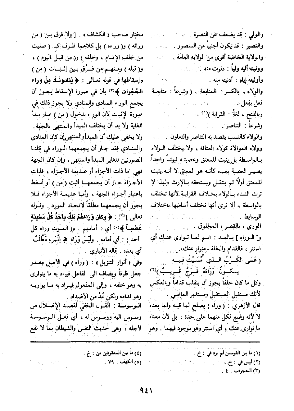 مُخْتَار صَاحب " الْكَشَّاف ". [وَلَا فرق بَين (من وَرَائه) و (وَرَاءه) بل كِلَاهُمَا ظرف ك (صليت من خلف الإِمَام، وَخَلفه) و (من قبل الْيَوْم) ، و (قبله) وَمِنْهُم من فرق بَين إِثْبَات (من) وإسقاطها فِي قَوْله تَعَالَى: {يُنَادُونَك من وَرَاء الحجرات} بِأَن فِي صُورَة الْإِسْقَاط يجوز أَن يجمع الوراء المنادى والمنادي وَلَا يجوز ذَلِك فِي صُورَة الْإِثْبَات لِأَن الوراء بِدُخُول (من) صَار مبدأ الْغَايَة وَلَا بُد أَن يخْتَلف المبدأ والمنتهى بالجهة. وَلَا يخفى عَلَيْك أَن المبدأ والمنتهى إِن كَانَ المنادى والمنادي فقد جَازَ أَن يجمعهما الوراء فِي كلتا الصُّورَتَيْنِ لتغاير المبدأ والمنتهى، وَإِن كَانَ الْجِهَة فَهِيَ إِمَّا ذَات الْأَجْزَاء أَو عديمة الْأَجْزَاء، فذات الْأَجْزَاء جَازَ أَن يجمعها أثبت (من) أَو أسقط بِاعْتِبَار أَجزَاء الْجِهَة، وَأما عديمة الْأَجْزَاء فَلَا يجوز أَن يجمعهما مُطلقًا لِاتِّحَاد المورد. وَقَوله تَعَالَى] : {وَكَانَ وَرَاءَهُمْ ملك يَأْخُذ كل سفينة غصبا} أَي: أمامهم. و (الْمَوْت وَرَاء كل أحد) : أَي أَمَامه. ولَيْسَ وَرَاءَ اللهِ لِلْمَرءِ مَطْلَبُ أَي بعده. قَالَه الْأَنْبَارِي.