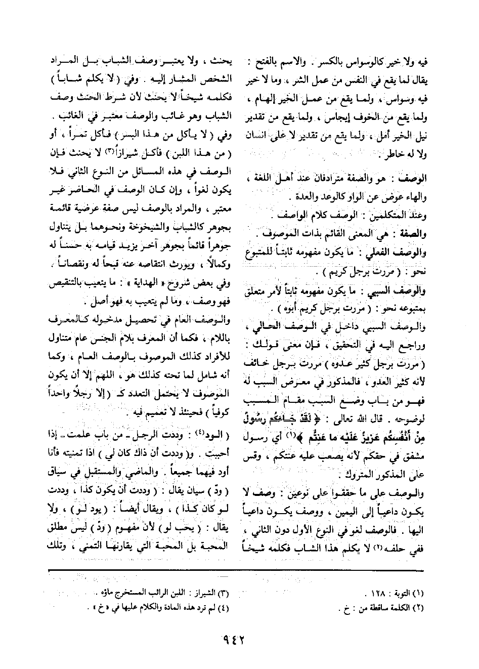 وَالْوَصْف الْعَام فِي تَحْصِيل مدخوله كالمعرف بِاللَّامِ، فَكَمَا أَن الْمُعَرّف بلام الْجِنْس عَام متناول للأفراد كَذَلِك الْمَوْصُوف بِالْوَصْفِ الْعَام، وكما أَنه شَامِل لما تَحْتَهُ كَذَلِك هُوَ، اللَّهُمَّ إِلَّا أَن يكون الْمَوْصُوف لَا يحْتَمل التَّعَدُّد ك (إِلَّا رجلا وَاحِدًا كوفياً) فَحِينَئِذٍ لَا تَعْمِيم فِيهِ.