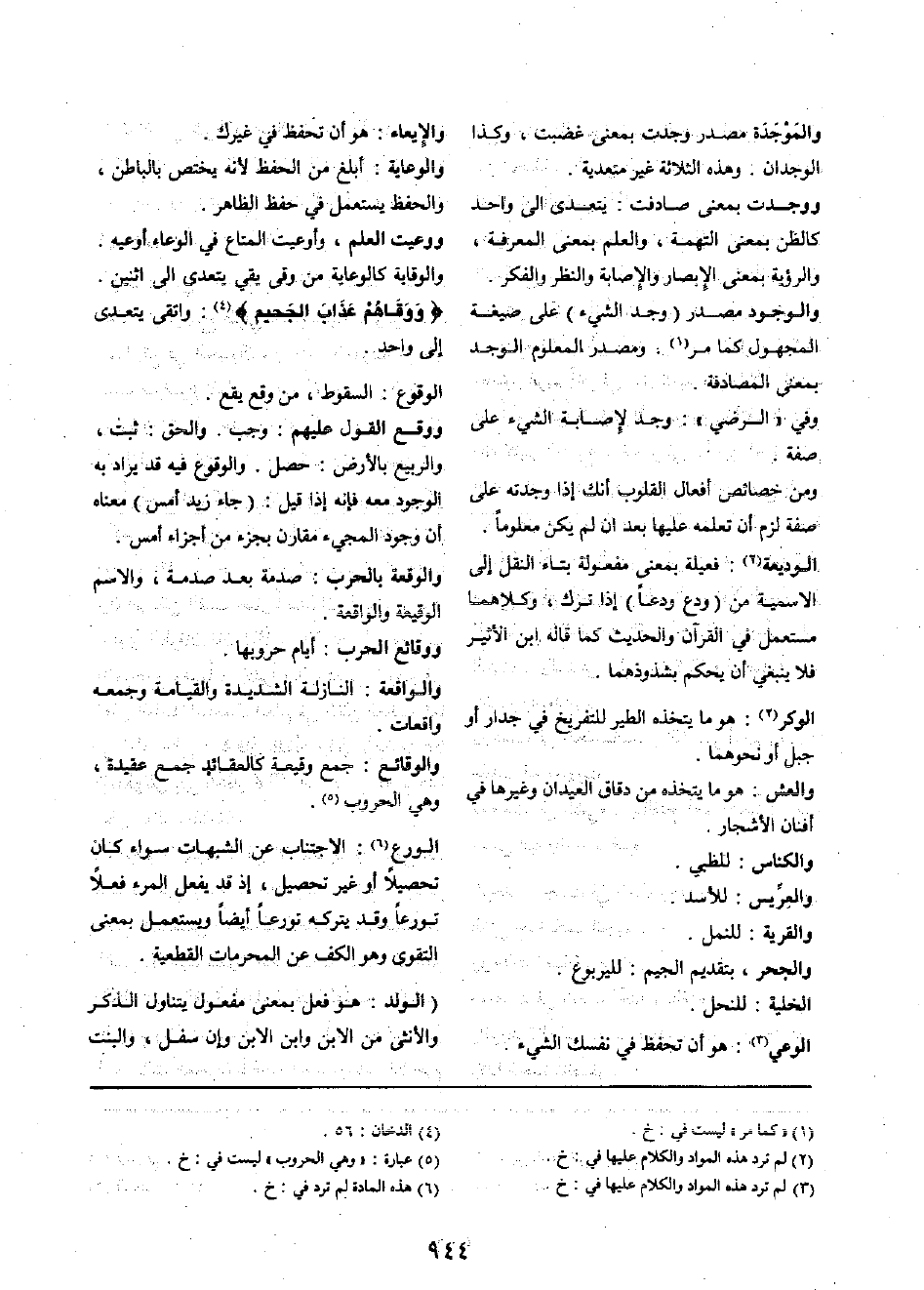 ووعيت الْعلم، وأوعيت الْمَتَاع فِي الْوِعَاء أوعيه. والوقاية كالوعاية من وقى يقي يتَعَدَّى إِلَى اثْنَيْنِ. {ووقاهم عَذَاب الْجَحِيم} : وَاتَّقَى يتَعَدَّى إِلَى وَاحِد.