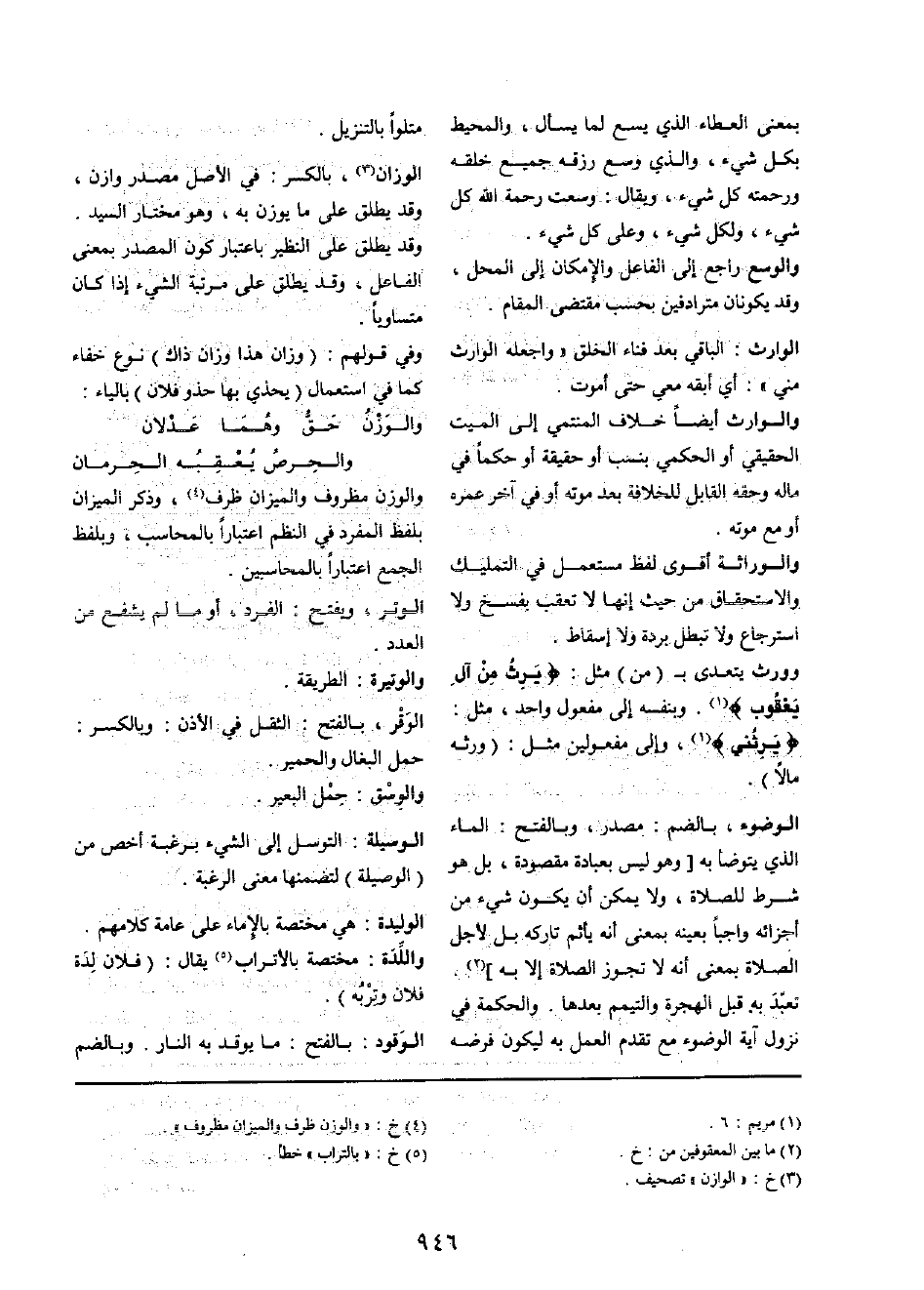 وَورث يتَعَدَّى ب (من) مثل: {يَرث من آل يَعْقُوب} . وبنفسه إِلَى مفعول وَاحِد، مثل: {يَرِثنِي} ، وَإِلَى مفعولين مثل: (وَرثهُ مَالا) .