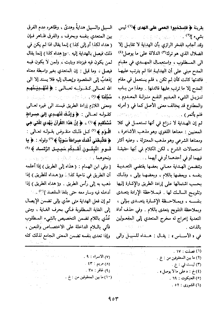 ومنعى اللَّازِم إراءة الطَّرِيق فيسند إِلَى غَيره تَعَالَى كَقَوْلِه تَعَالَى: {وَإنَّك لتهدي إِلَى صِرَاط مُسْتَقِيم} ، {إِن هَذَا الْقُرْآن يهدي للَّتِي هِيَ أقوم} كل ذَلِك منقوض بقوله تَعَالَى: {فاتبعني أهدك صراطا سويا} وَقَوله: {يَا قوم اتبعون أهدكم سَبِيل الرشاد} وَنَحْوهمَا.