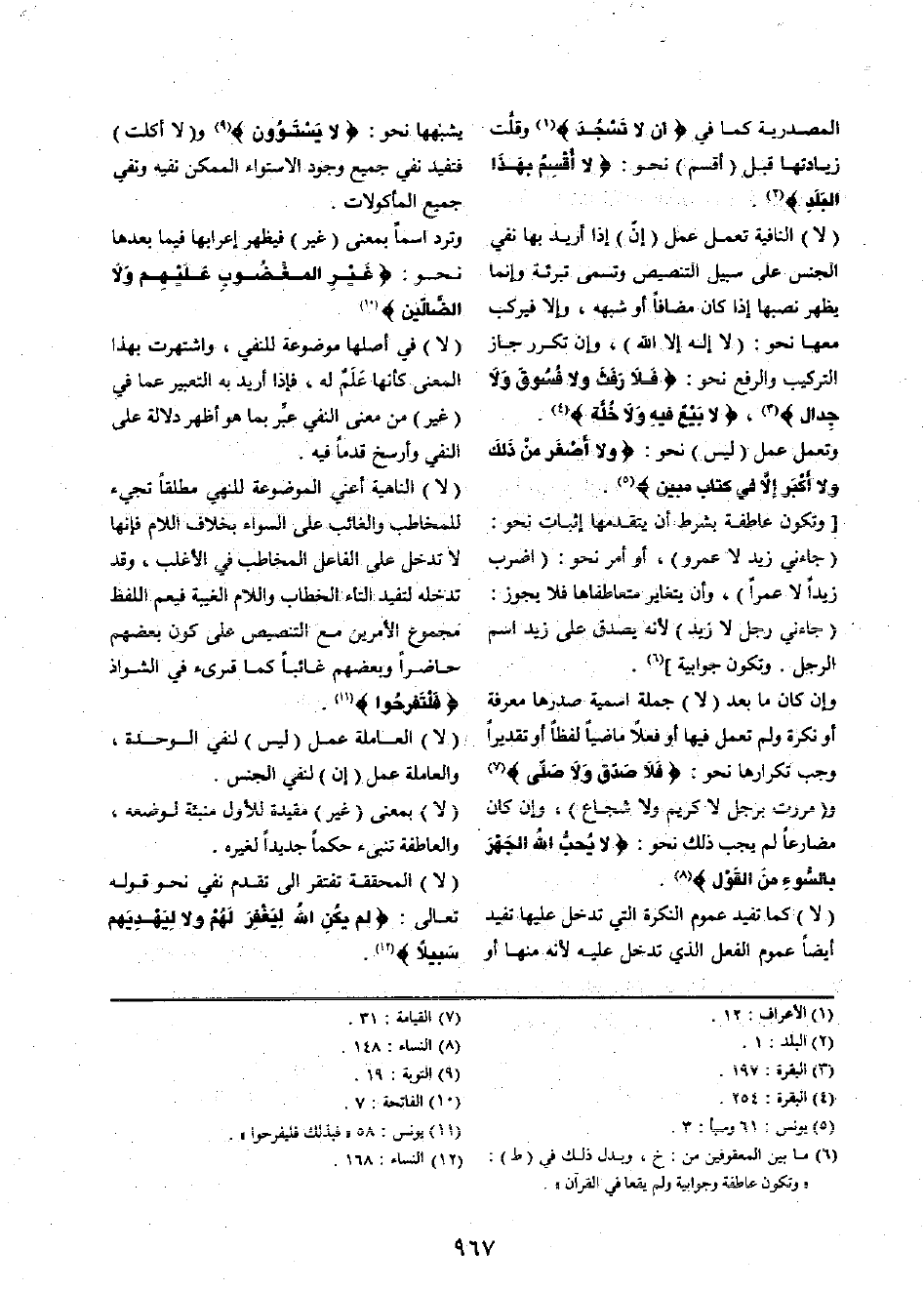 (لَا) النافية تعْمل عمل (إنّ) إِذا أُرِيد بهَا نفي الْجِنْس على سَبِيل التَّنْصِيص وَتسَمى تبرئة وَإِنَّمَا يظْهر نصبها إِذا كَانَ مُضَافا أَو شبهه، وَإِلَّا فيركب مَعهَا نَحْو: (لَا إِلَه إِلَّا الله) ، وَإِن تكَرر جَازَ التَّرْكِيب وَالرَّفْع نَحْو: {فَلَا رفث وَلَا فسوق وَلَا جِدَال} ، {لَا بيع فِيهِ وَلَا خلة} .
