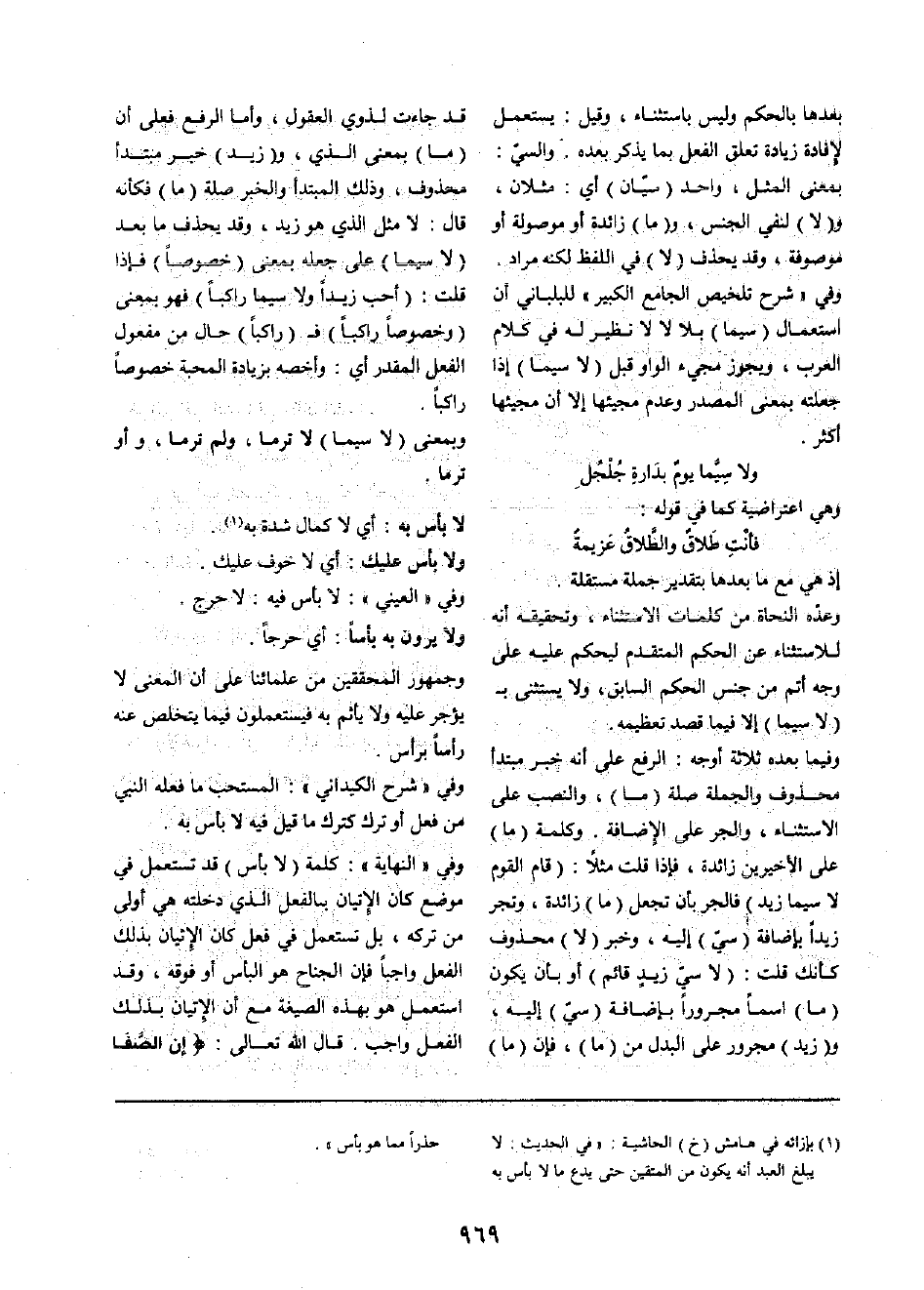 وعدّه النُّحَاة من كَلِمَات الِاسْتِثْنَاء، وتحقيقه أَنه للاستثناء عَن الحكم الْمُتَقَدّم ليحكم عَلَيْهِ على وَجه أتم من جنس الحكم السَّابِق، وَلَا يسْتَثْنى ب (لَا سِيمَا) إِلَّا فِيمَا قصد تَعْظِيمه.