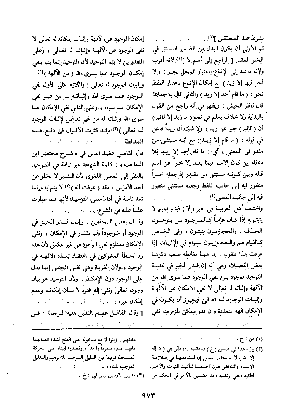 وَاخْتلف أهل الْعَرَبيَّة فِي خبر (لَا) فبنو تَمِيم لَا يثبتونه إِذا كَانَ عَاما كالموجود بل يوجبون الْحَذف. والحجازيون يثبتون، وَفِي الْخَاص كالقيام هم والحجازيون سَوَاء فِي الْإِثْبَات إِذا عرفت هَذَا فَنَقُول: إِن هَهُنَا مغالطة صعبة ذكرهَا بعض الْفُضَلَاء وَهِي أَنه إِن قدر الْخَبَر فِي كلمة التَّوْحِيد مَوْجُود يلْزم نفي الْوُجُود عَمَّا سوى الله من الْآلهَة وإثباته لَهُ تَعَالَى لَا نفي الْإِمْكَان عَن الْآلهَة وَإِثْبَات الْوُجُود لَهُ تَعَالَى فَيجوز أَن يكون فِي الْإِمْكَان آلِهَة مُتعَدِّدَة وَإِن قدر مُمكن يلْزم مِنْهُ نفي