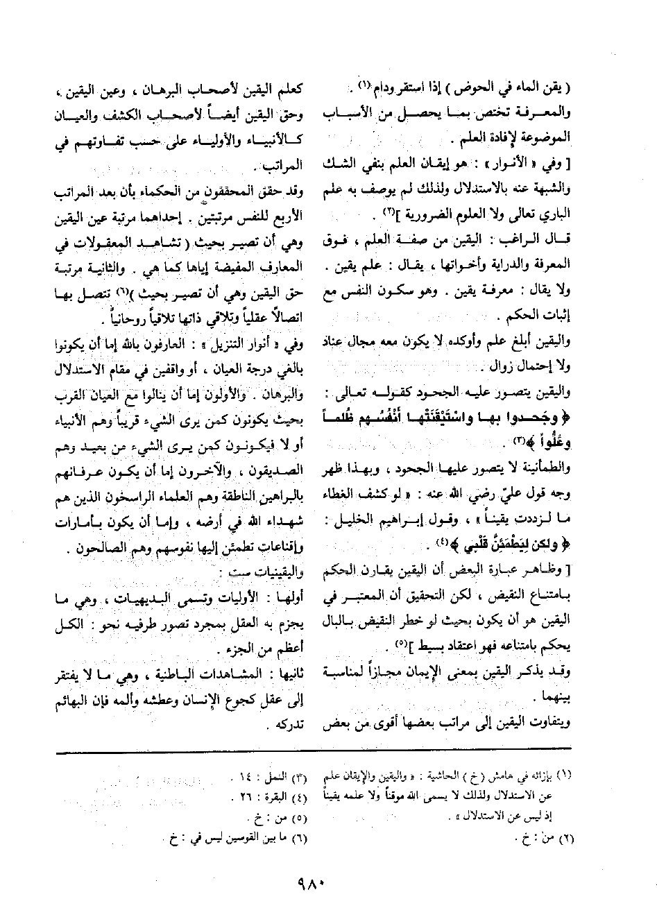 قَالَ الرَّاغِب: الْيَقِين من صفة الْعلم، فَوق الْمعرفَة والدراية وَأَخَوَاتهَا، يُقَال: علم يَقِين. وَلَا يُقَال: معرفَة يَقِين. وَهُوَ سُكُون النَّفس مَعَ إِثْبَات الحكم.