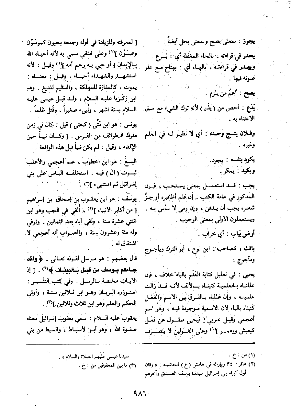 [لمعرفته وللزيادة فِي أَوله وَجمعه يحيون كموسون وعسَيْون] وعَلى الثَّانِي سمي بِهِ لِأَنَّهُ أَحْيَاهُ الله بِالْإِيمَان [أَو حييّ بِهِ رحم أمه] وَقيل: لِأَنَّهُ اسْتشْهد وَالشُّهَدَاء أَحيَاء، وَقيل: مَعْنَاهُ: يَمُوت، كالمفازة للمهلكة، والسليم للديغ. وَهُوَ ابْن زَكَرِيَّا عَلَيْهِ السّلم، ولد قبل عِيسَى عَلَيْهِ السَّلَام بِسِتَّة أشهر، ونبيء صغيراُ، وقُتل ظلما.