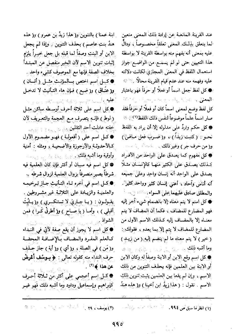 ابْنة عمنَا) بِالتَّنْوِينِ و (هَذَا زيدٌ بن عَمْرو) و (هَذِه هندُ بنت عَاصِم) بِحَذْف التَّنْوِين. وَإِذا لم يَجْعَل الابْن أَو الْبِنْت وَصفا لما قبله بل جعل خَبرا يلْزم إِثْبَات تَنْوِين الِاسْم لِأَن الْخَبَر مُنْفَصِل عَن الْمُبْتَدَأ بِخِلَاف الصّفة فَإِنَّهَا مَعَ الْمَوْصُوف كشيء وَاحِد.