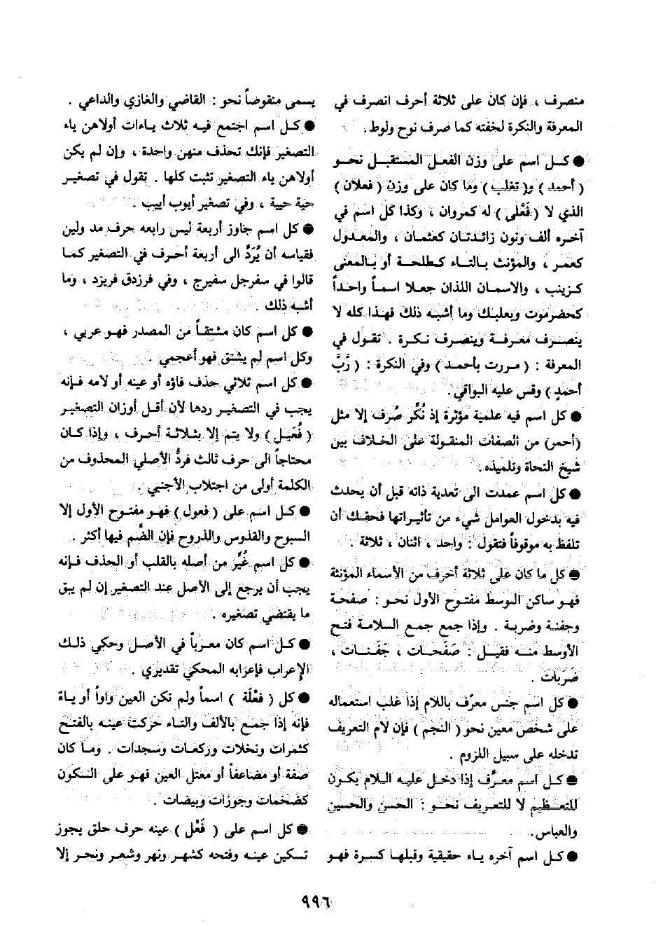 كل اسْم على وزن الْفِعْل الْمُسْتَقْبل نَحْو (أَحْمد) و (تغلب) وَمَا كَانَ على وزن (فعلان) الَّذِي لَا (فَعْلى) لَهُ كمروان، وَكَذَا كل اسْم فِي آخِره ألف وَنون زائدتان كعثمان، والمعدول كعمر، والمؤنث بِالتَّاءِ كطلحة أَو بِالْمَعْنَى كزينب، والاسمان اللَّذَان جعلا اسْما وَاحِدًا كحضرموت وبعلبك وَمَا أشبه ذَلِك فَهَذَا كُله لَا ينْصَرف معرفَة وينصرف نكرَة. تَقول فِي الْمعرفَة: (مَرَرْت بِأَحْمَد) وَفِي النكرَة: (رُبَّ أحمدٍ) وَقس عَلَيْهِ الْبَوَاقِي.