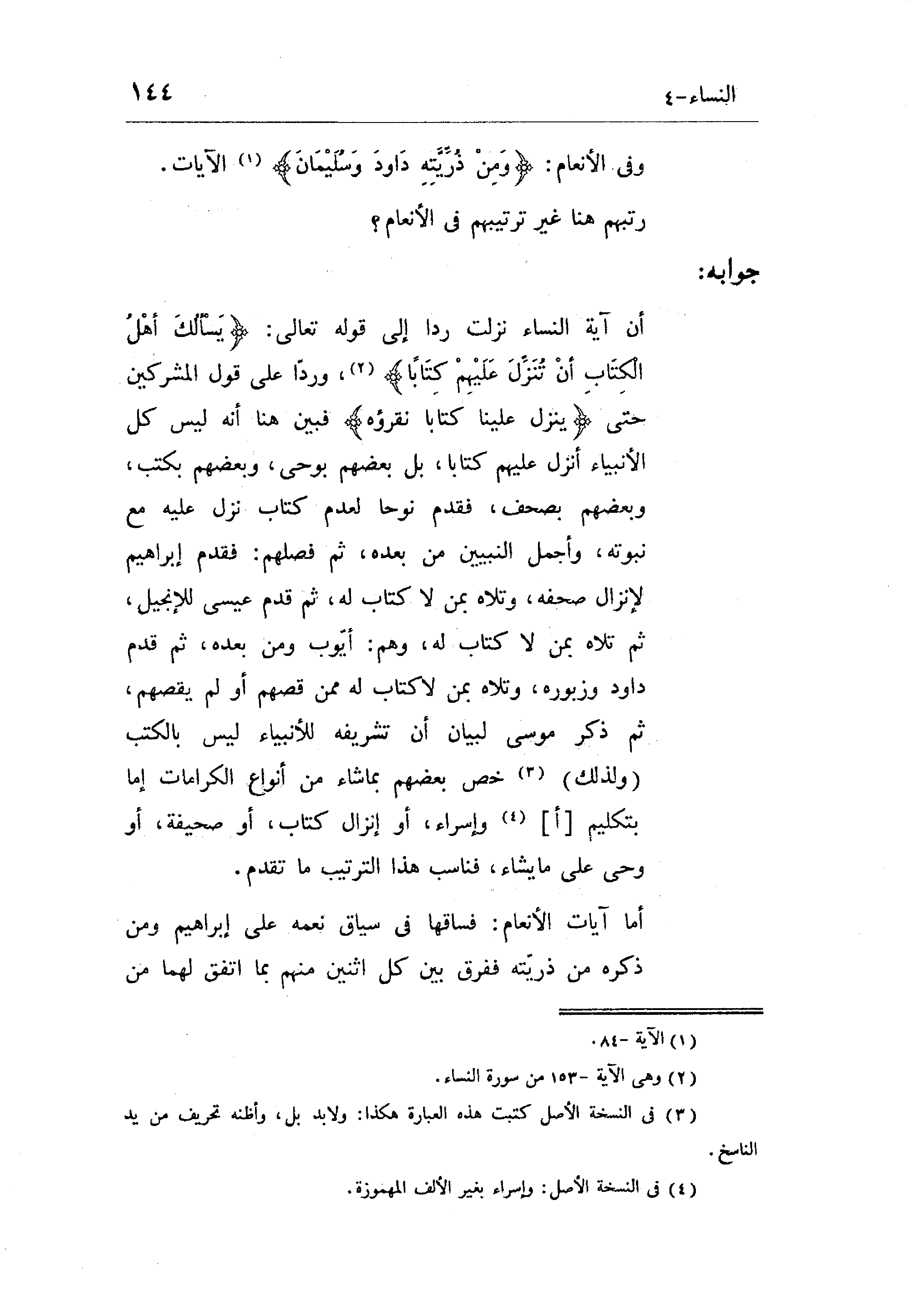 أن آية النساء نزلت ردا إلى قوله تعالى: (يَسْأَلُكَ أَهْلُ الْكِتَابِ أَنْ تُنَزِّلَ عَلَيْهِمْ كِتَابًا) ، وهذا على قول المشركين حتى (تنزل علينا كتابا نقرؤه) فبين هنا أنه ليس كل الأنبياء أنزل عليهم كتابا، بل بعضهم بوحي، وبعضهم بكتب، وبعضهم بصحف، فقدم نوحا لعدم كتاب نزل عليه مع نبوته، وأجمل النبيون من بعده، ثم فصلهم: فقدم إبراهيم لإنزال صحفه، وتلاه بمن لا كتاب له، ثم قدم عيسى للإنجيل، ثم تلاه بمن لا كتاب له، وهم: أيوب ومن بعده، ثم قدم داود وزبوره، وتلاه بمن كتاب له ممن قصهم أو لم يقصهم، ثم ذكر موسى لبيان أن تشريفه للأنبياء ليس بالكتب ولذلك خص بعضهم بما شاء من أنواع الكرامات إما بتكليم أو إسراء، أو إنزال كتاب، أو صحيفة، أو وحي على ما يشاء، فناسب هذا الترتيب ما تقدم.