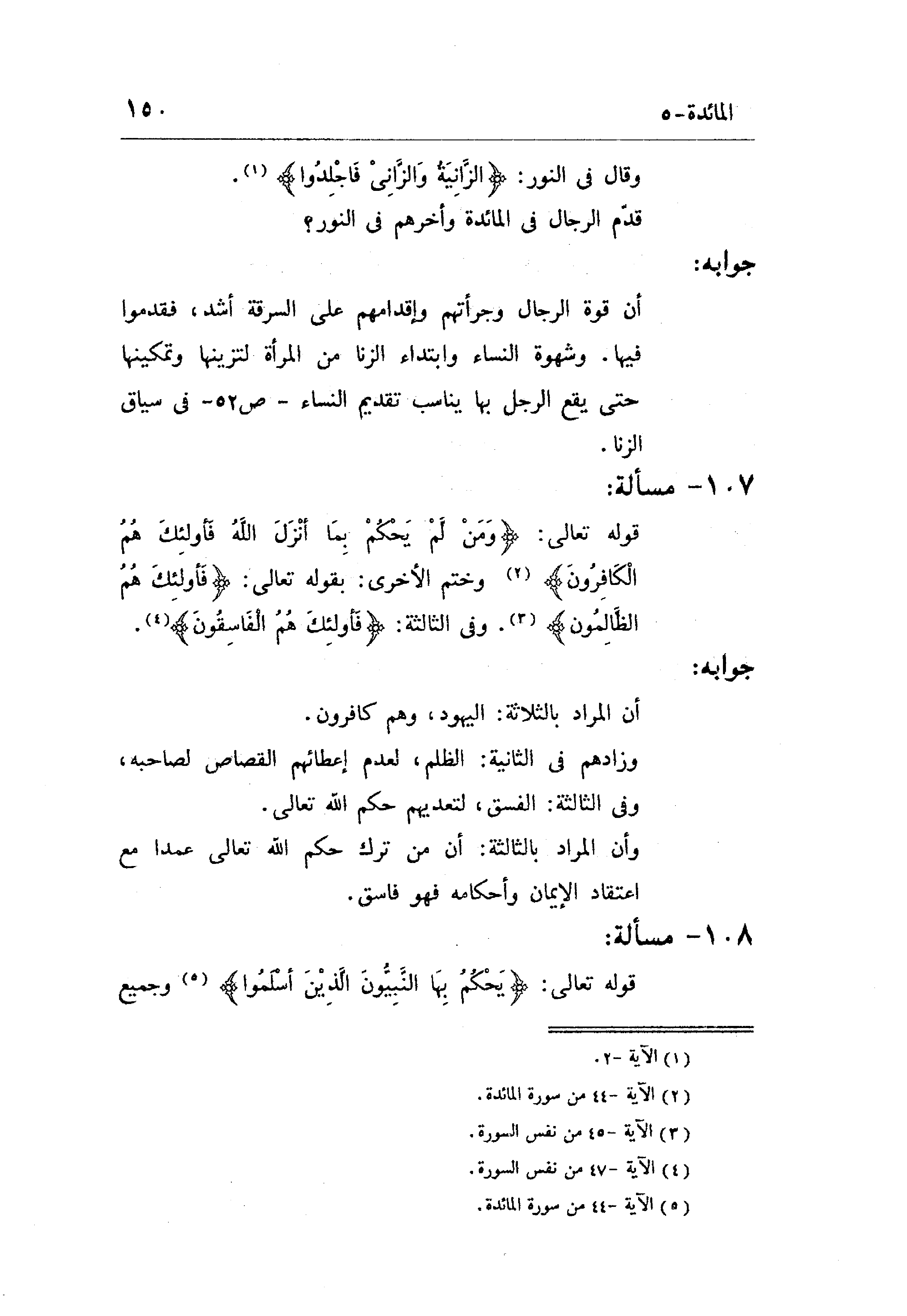 قوله تعالى: (وَمَنْ لَمْ يَحْكُمْ بِمَا أَنْزَلَ اللَّهُ فَأُولَئِكَ هُمُ الْكَافِرُونَ) وختم الأخرى: بقوله تعالى: (فَأُولَئِكَ هُمُ الظَّالِمُونَ) . وفى الثالثة: (فَأُولَئِكَ هُمُ الْفَاسِقُونَ) .