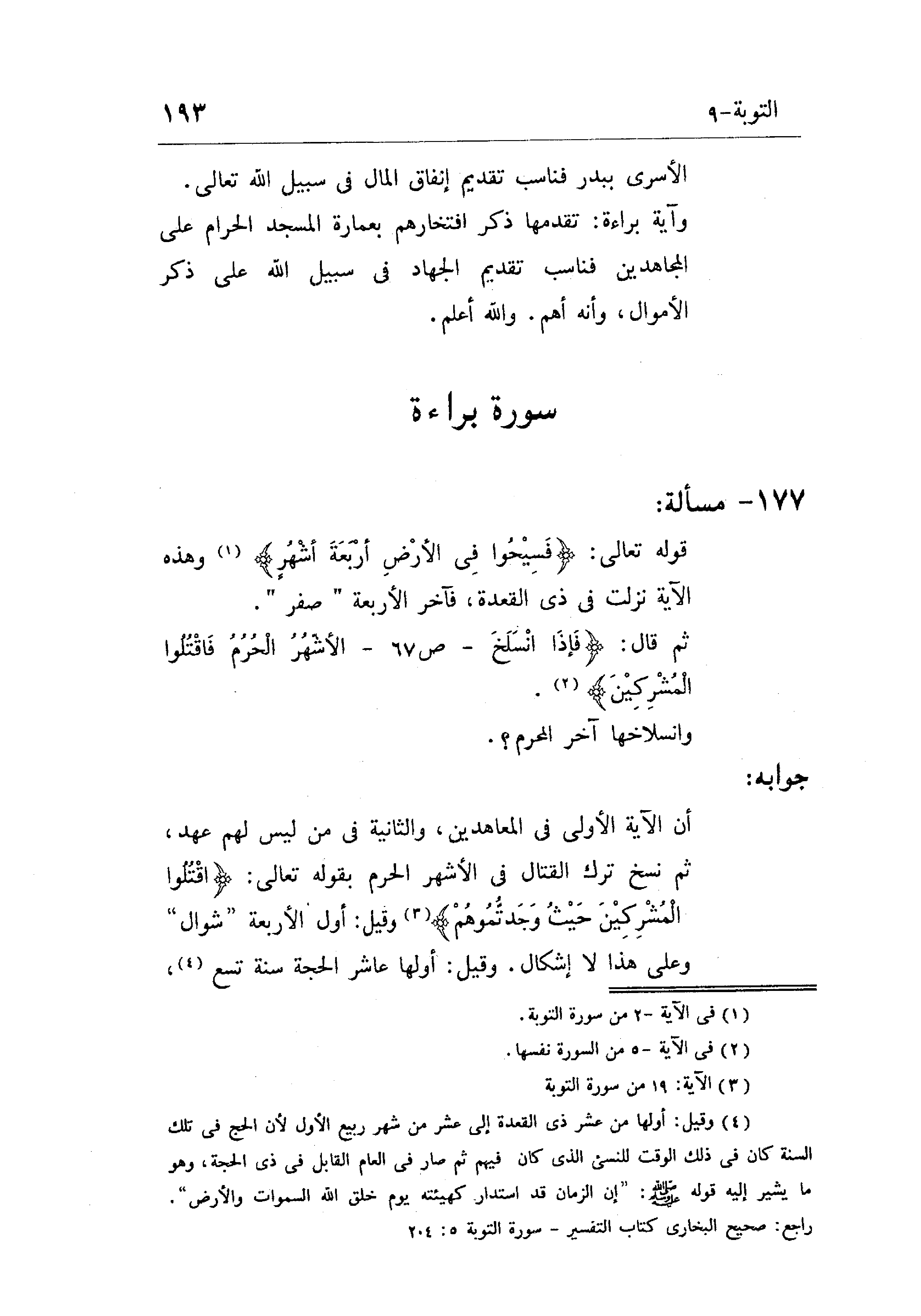 ثم نسخ ترك القتال في الأشهر الحرم بقوله تعالى: (اقْتُلُوا الْمُشْرِكِينَ حَيْثُ وَجَدْتُمُوهُمْ) وقيل: أول. الأربعة " شوال "