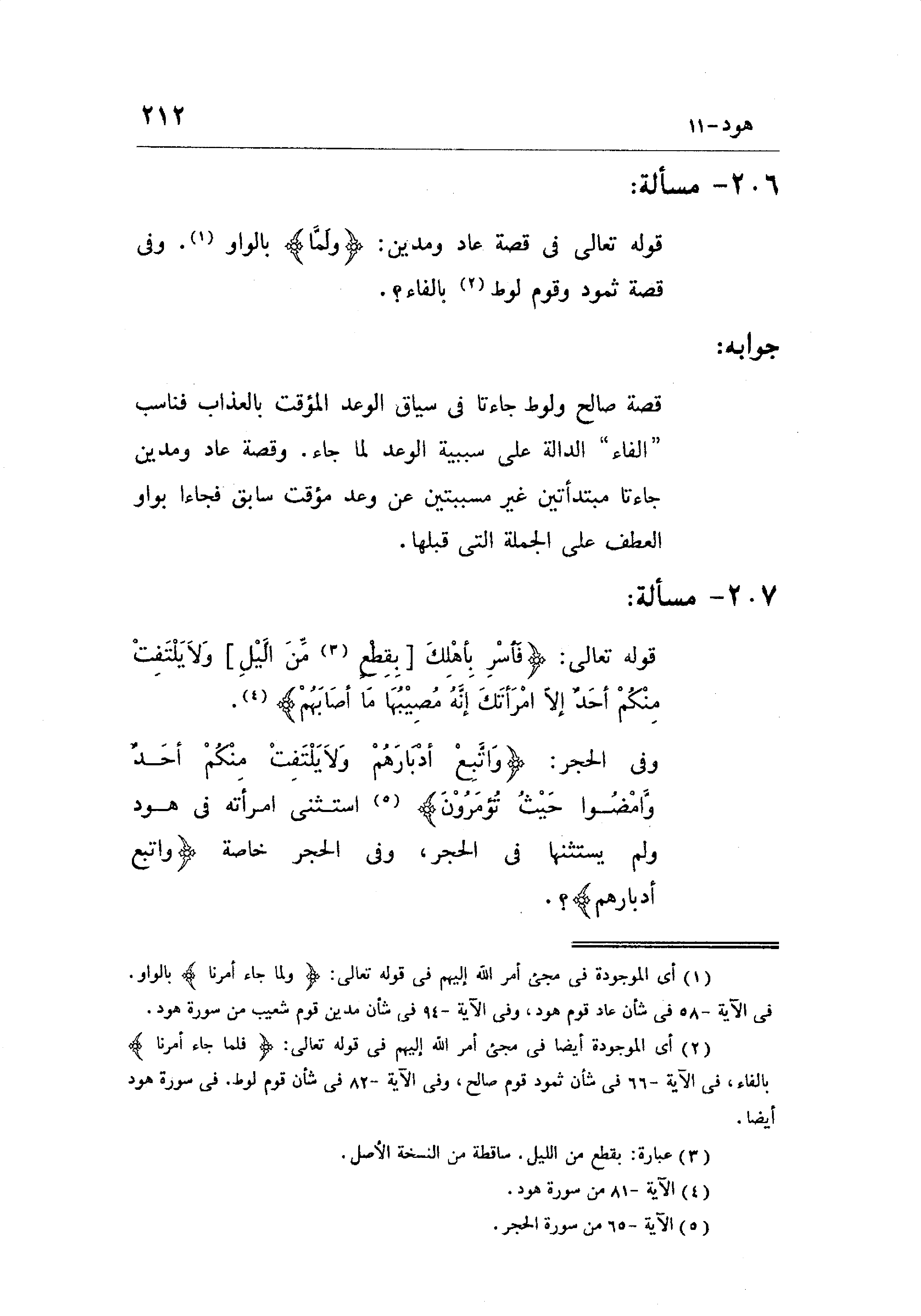 وفى الحجر: (وَاتَّبِعْ أَدْبَارَهُمْ وَلَا يَلْتَفِتْ مِنْكُمْ أَحَدٌ وَامْضُوا حَيْثُ تُؤْمَرُونَ (65)) استثنى امرأته فى هود ولم يستثنها في الحجر، وفى الحجر خاصة (وَاتَّبِعْ أَدْبَارَهُمْ) ؟ .