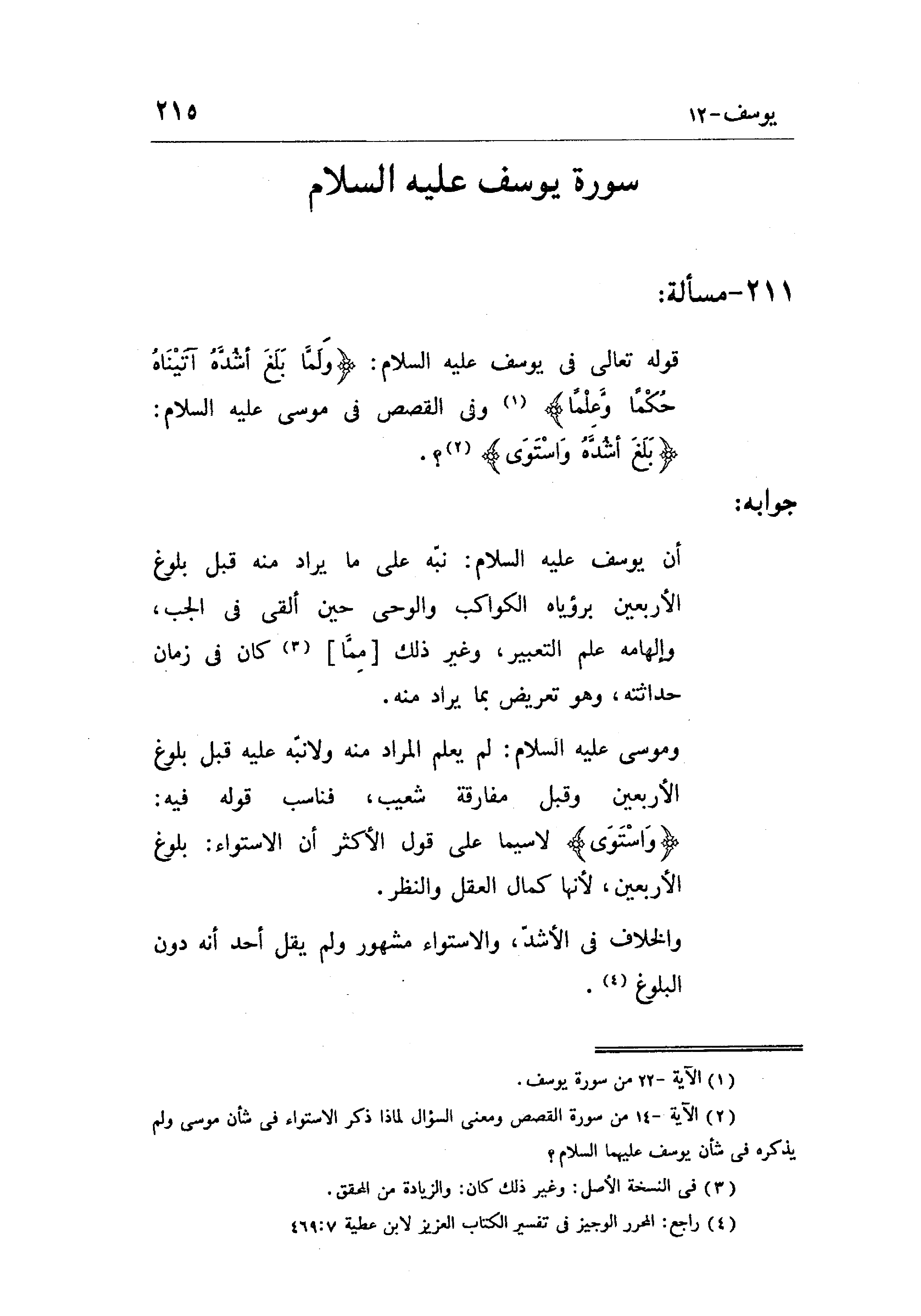 قوله تعالى في يوسف عليه السلام: (وَلَمَّا بَلَغَ أَشُدَّهُ آتَيْنَاهُ حُكْمًا وَعِلْمًا) وفي القصص في موسى عليه السلام: (بَلَغَ أَشُدَّهُ وَاسْتَوَى) ؟ .