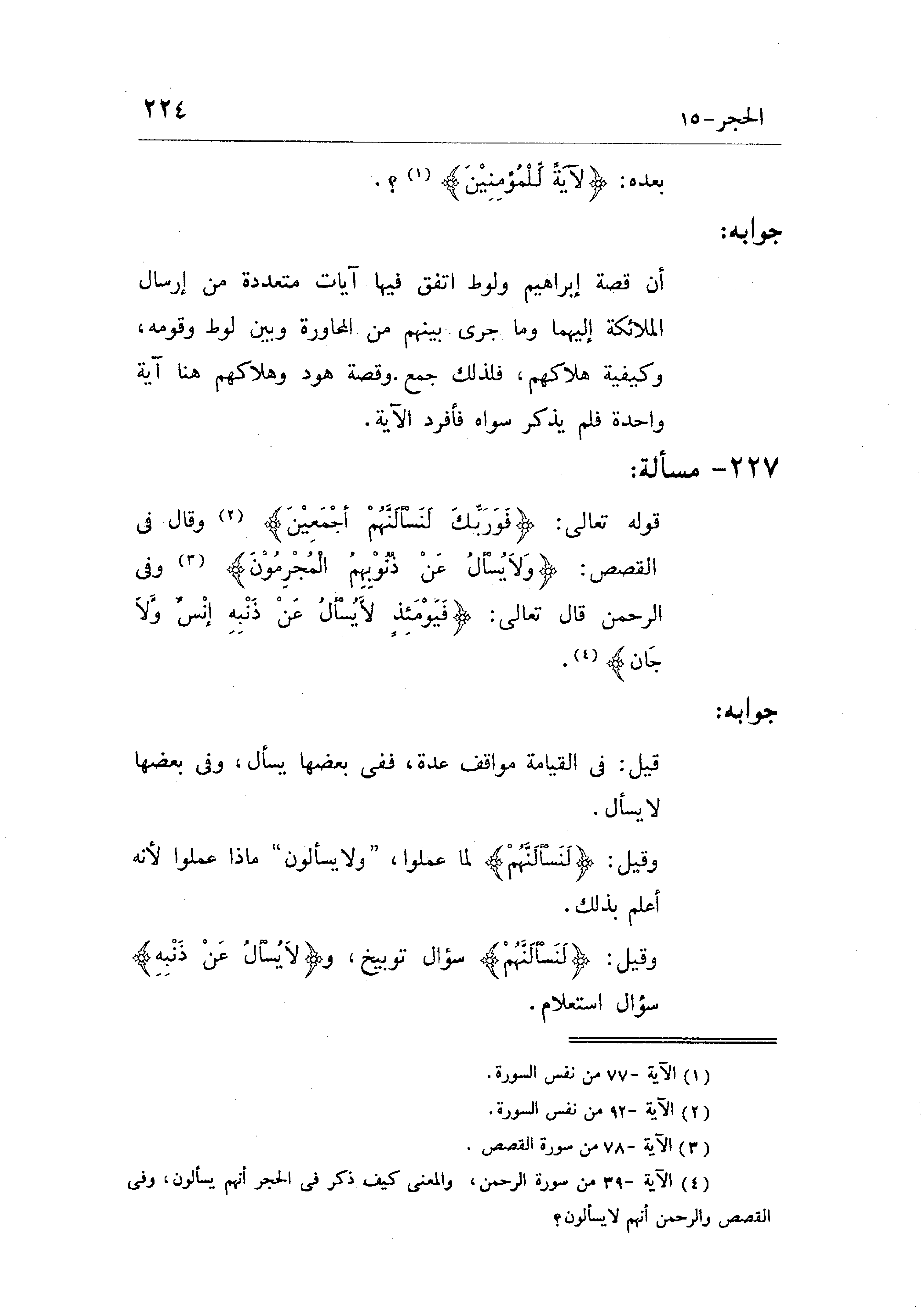 القصص: (وَلَا يُسْأَلُ عَنْ ذُنُوبِهِمُ الْمُجْرِمُونَ (78)) وفى الرحمن قال تعالى: (فَيَوْمَئِذٍ لَا يُسْأَلُ عَنْ ذَنْبِهِ إِنْسٌ وَلَا جَانٌّ (39)) .