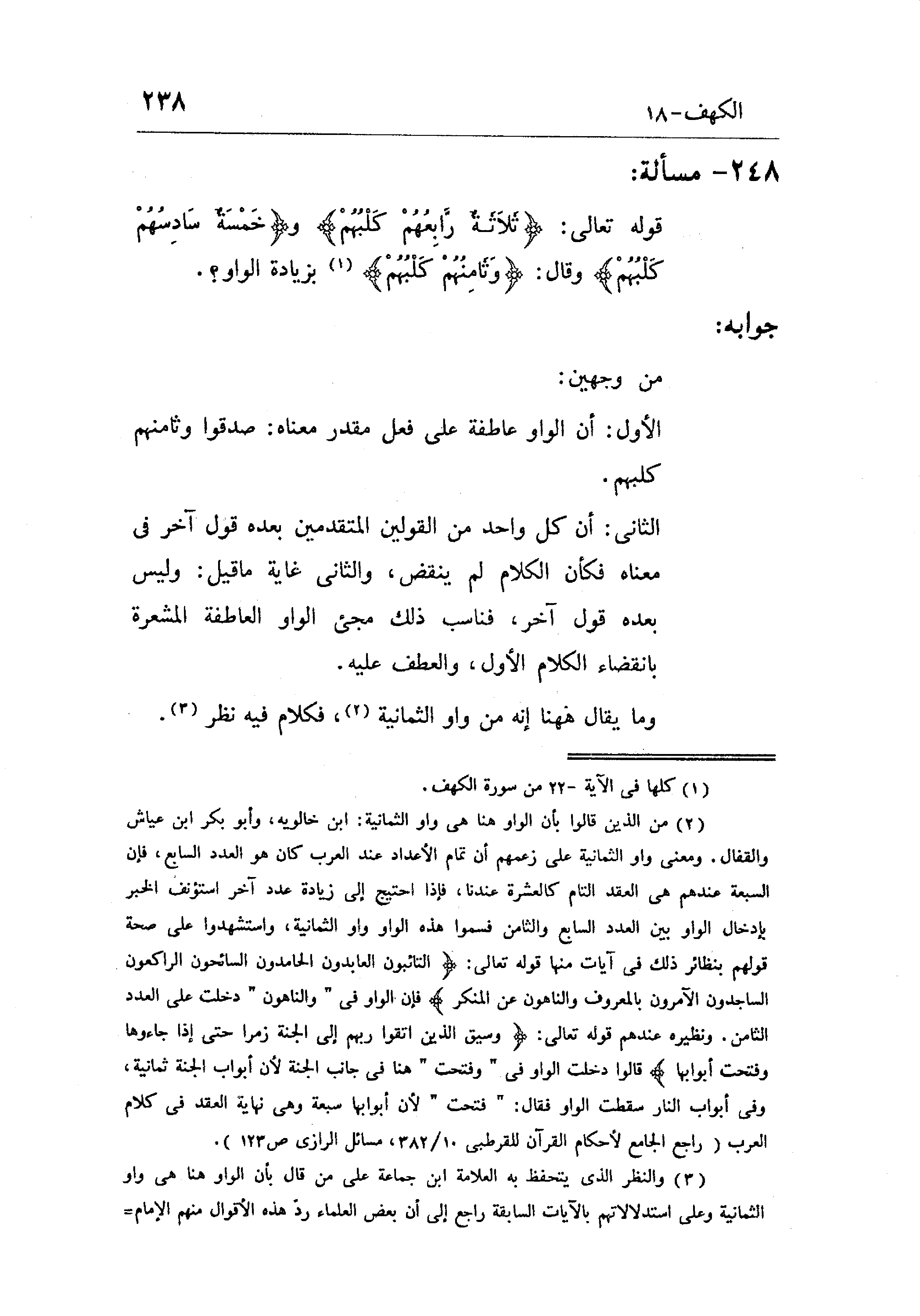قوله تعالى: (ثَلَاثَةٌ رَابِعُهُمْ كَلْبُهُمْ) و (خَمْسَةٌ سَادِسُهُمْ كَلْبُهُمْ) وقال: (وَثَامِنُهُمْ كَلْبُهُمْ)