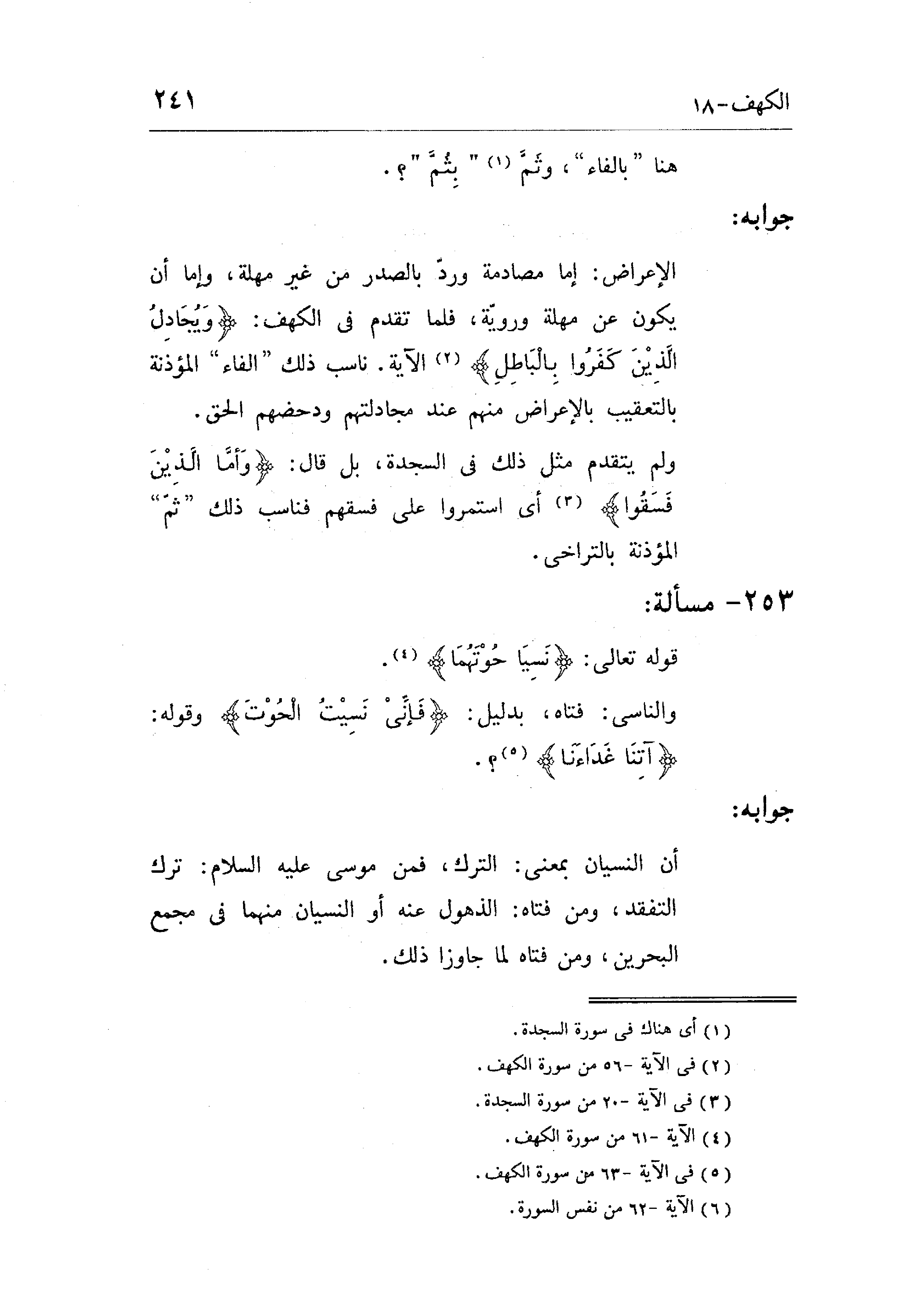 قوله تعالى: (نَسِيَا حُوتَهُمَا) . والناسى: فتاه، بدليل: (فَإِنِّي نَسِيتُ الْحُوتَ) وقوله (آتِنَا غَدَاءَنَا) ؟ .