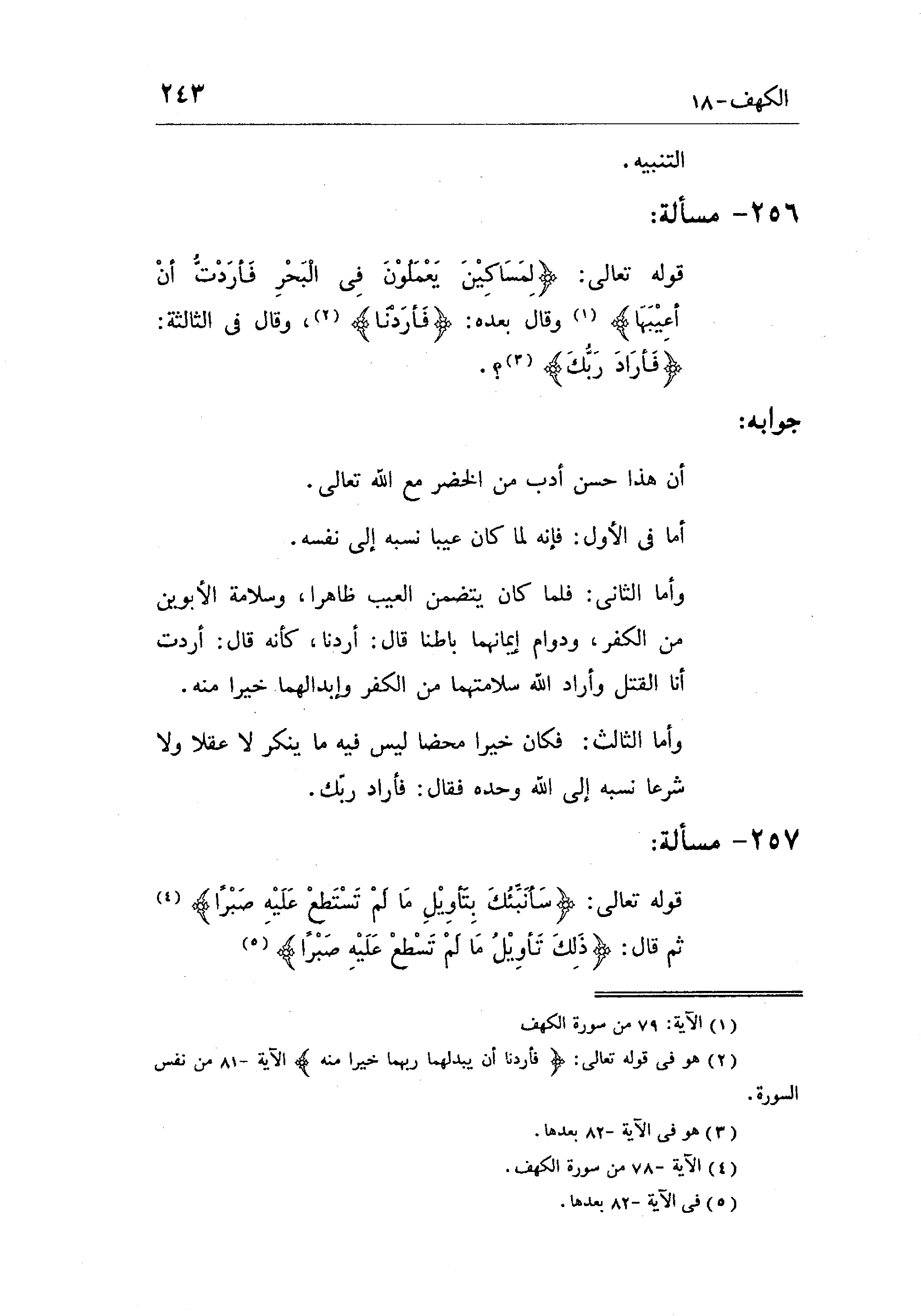 قوله تعالى: (لِمَسَاكِينَ يَعْمَلُونَ فِي الْبَحْرِ فَأَرَدْتُ أَنْ أَعِيبَهَا) وقال بعده: (فَأَرَدْنَا) ، وقال في الثالثة: (فَأَرَادَ رَبُّكَ) ؟ .
