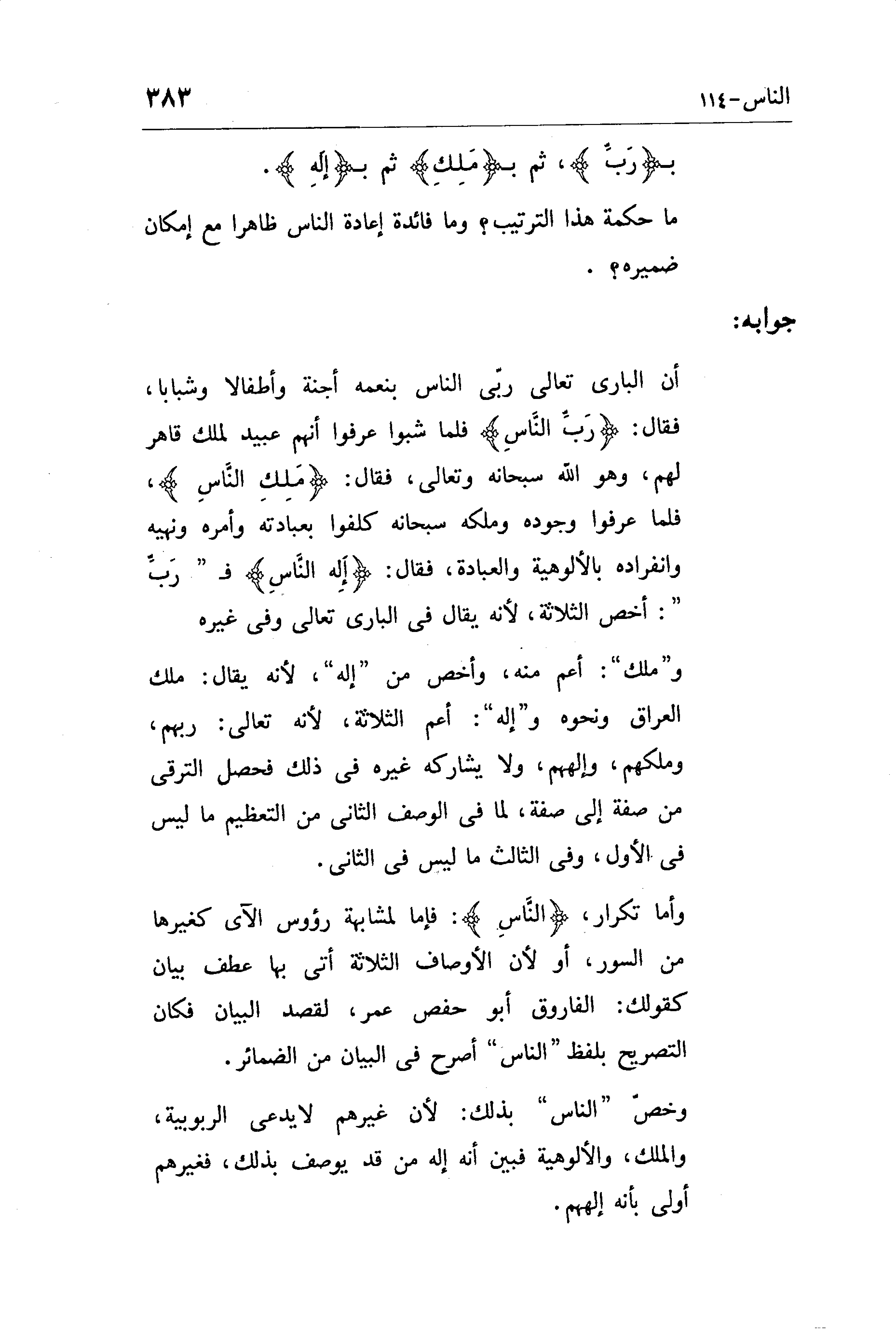 أن الباري تعالى ربى الناس بنعمه أجنَّةً وأطفالا وشبابا، فقال: (رَبِّ النَّاسِ) فلما شبوا عرفوا أنهم عبيد لملك قاهر لهم، وهو الله سبحانه وتعالى، فقال: (مَلِكِ النَّاسِ) ، فلما عرفوا وجوده وملكه سبحانه كلفوا بعبادته وأمره ونهيه وانفراده بالألوهية والعبادة، فقال: (إِلَهِ النَّاسِ) ف " رب ": أخص الثلاثة، لأنه يقال في الباري تعالى وفى غيره و"ملك ": أعم منه، وأخص من "إله "، لأنه يقال: ملك العراق ونحوه و"إله ": أعم الثلاثة، لأنه تعالى: ربهم، وملكهم، وإلههم، ولا يشاركه غيره في ذلك فحصل الترقى من صفة إلى صفة، لما في الوصف الثاني من التعظيم ما ليس فى الأول، وفى الثالث ما ليس في الثاني.