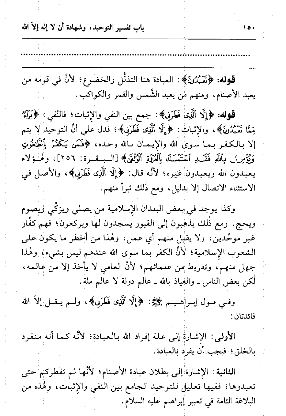 قوله: {إِلاَّ الَّذِي فَطَرَنِي} جمع بين النفي والإثبات; فالنفي: {بَرَاءٌ مِمَّا تَعْبُدُونَ} والإثبات: {إِلاَّ الَّذِي فَطَرَنِي} فدل على أن التوحيد لا يتم إلا بالكفر بما سوى الله والإيمان بالله وحده: {فَمَنْ يَكْفُرْ بِالطَّاغُوتِ وَيُؤْمِنْ بِاللَّهِ فَقَدِ اسْتَمْسَكَ بِالْعُرْوَةِ الْوُثْقَى} وهؤلاء يعبدون الله ويعبدون غيره; لأنه قال: {إِلاَّ الَّذِي فَطَرَنِي} والأصل في الاستثناء الاتصال إلا بدليل، ومع ذلك تبرأ منهم.