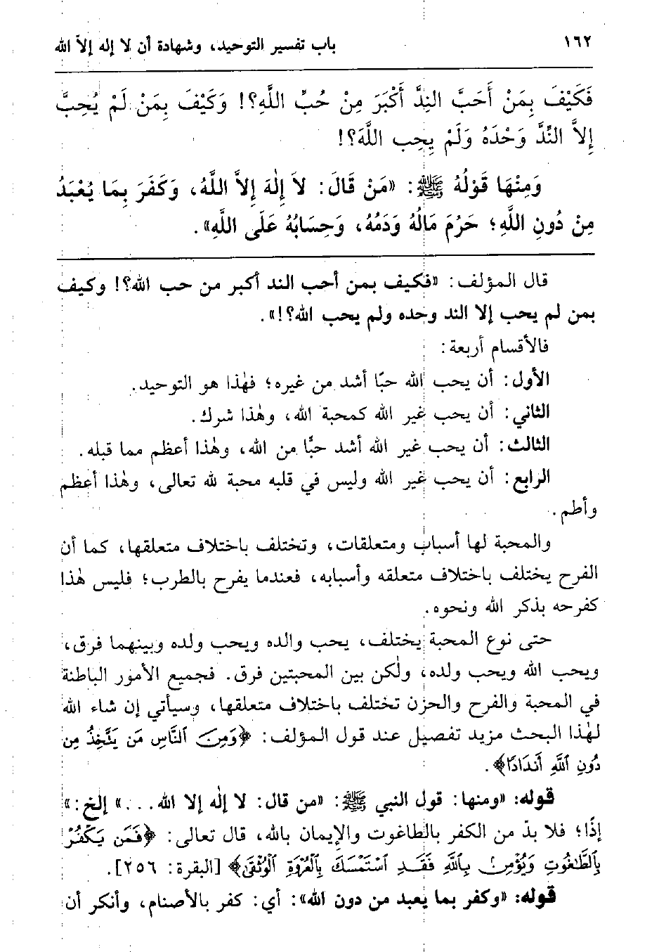 حتى نوع المحبة يختلف، يحب والده ويحب ولده وبينهما فرق، ويحب الله ويحب ولده، ولكن بين المحبتين فرق. فجميع الأمور الباطنة في المحبة والفرح والحزن، تختلف باختلاف متعلقها، وسيأتي إن شاء الله لهذا البحث مزيد تفصيل عند قول المؤلف: {وَمِنَ النَّاسِ مَنْ يَتَّخِذُ مِنْ دُونِ اللَّهِ أَنْدَاداً} 2.