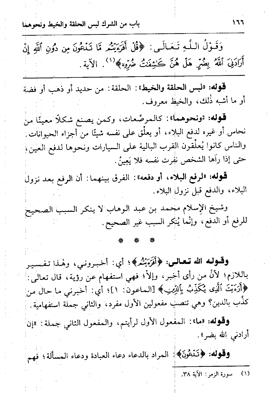 وقول الله تعالى: {أَفَرَأَيْتُمْ مَا تَدْعُونَ مِنْ دُونِ اللَّهِ إِنْ أَرَادَنِيَ اللَّهُ بِضُرٍّ هَلْ هُنَّ كَاشِفَاتُ ضُرِّهِ} 1 الآية.