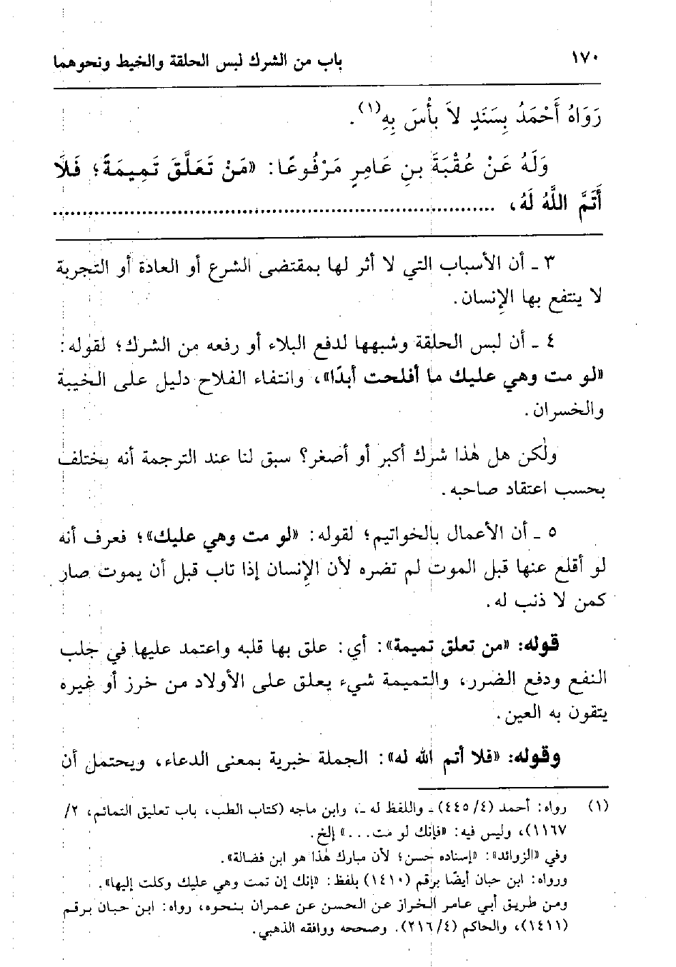 1 رواه: أحمد (4/445) -واللفظ له-, وابن ماجه (كتاب الطب, باب تعليق التمائم, 2/ 1167) , وليس فيه: "فإنك لو مت ... " إلخ. وفي "الزوائد": "إسناده حسن; لأن مبارك هذا هو ابن فضالة". ورواه: ابن حبان أيضا برقم (1410) بلفظ: "إنك إن تمت وهي عليك وكلت إليها". ومن طريق أبي عامر الخراز عن الحسن عن عمران بنحوه, رواه: ابن حبان برقم (1411) , والحاكم (4/216) . وصححه ووافقه الذهبي.
