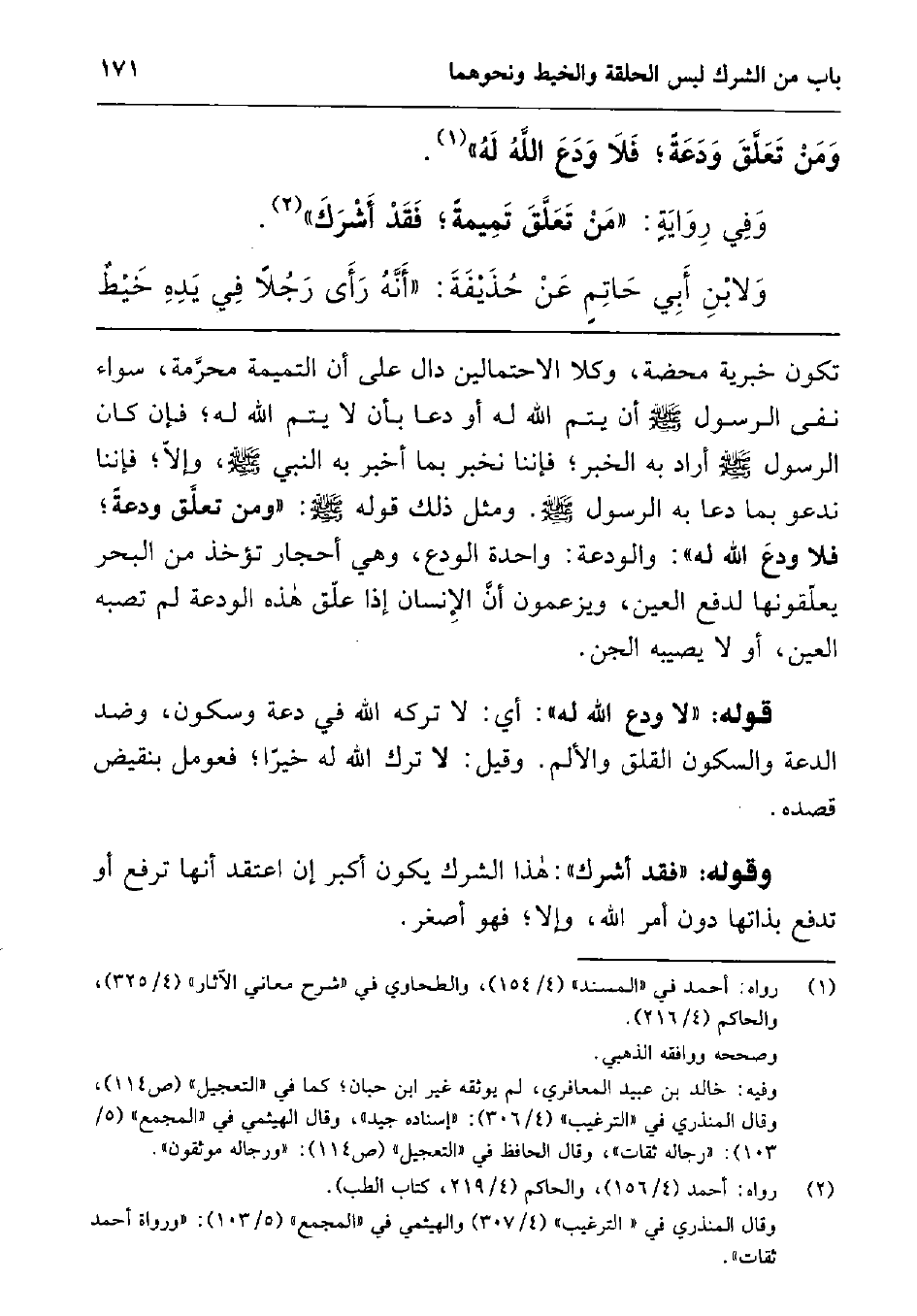 تكون خبرية محضة، وكلا الاحتمالين دال على أن التميمة محرمة سواء نفى الرسول صلى الله عليه وسلم أن يتم الله، له أو دعا بأن لا يتم الله له; فإن كان الرسول صلى الله عليه وسلم أراد به الخبر; فإننا نخبر بما أخبر به النبي صلى الله عليه وسلم، وإلا; فإننا ندعو بما دعا به الرسول صلى الله عليه وسلم ومثل ذلك قوله صلى الله عليه وسلم " ومن تعلق ودعة; فلا ودع الله له " والودعة: واحدة الودع، وهي أحجار تؤخذ من البحر يعلقونها لدفع العين، ويزعمون أن الإنسان إذا علق هذه الودعة؛ لم تصبه العين، أو لا يصيبه الجن.