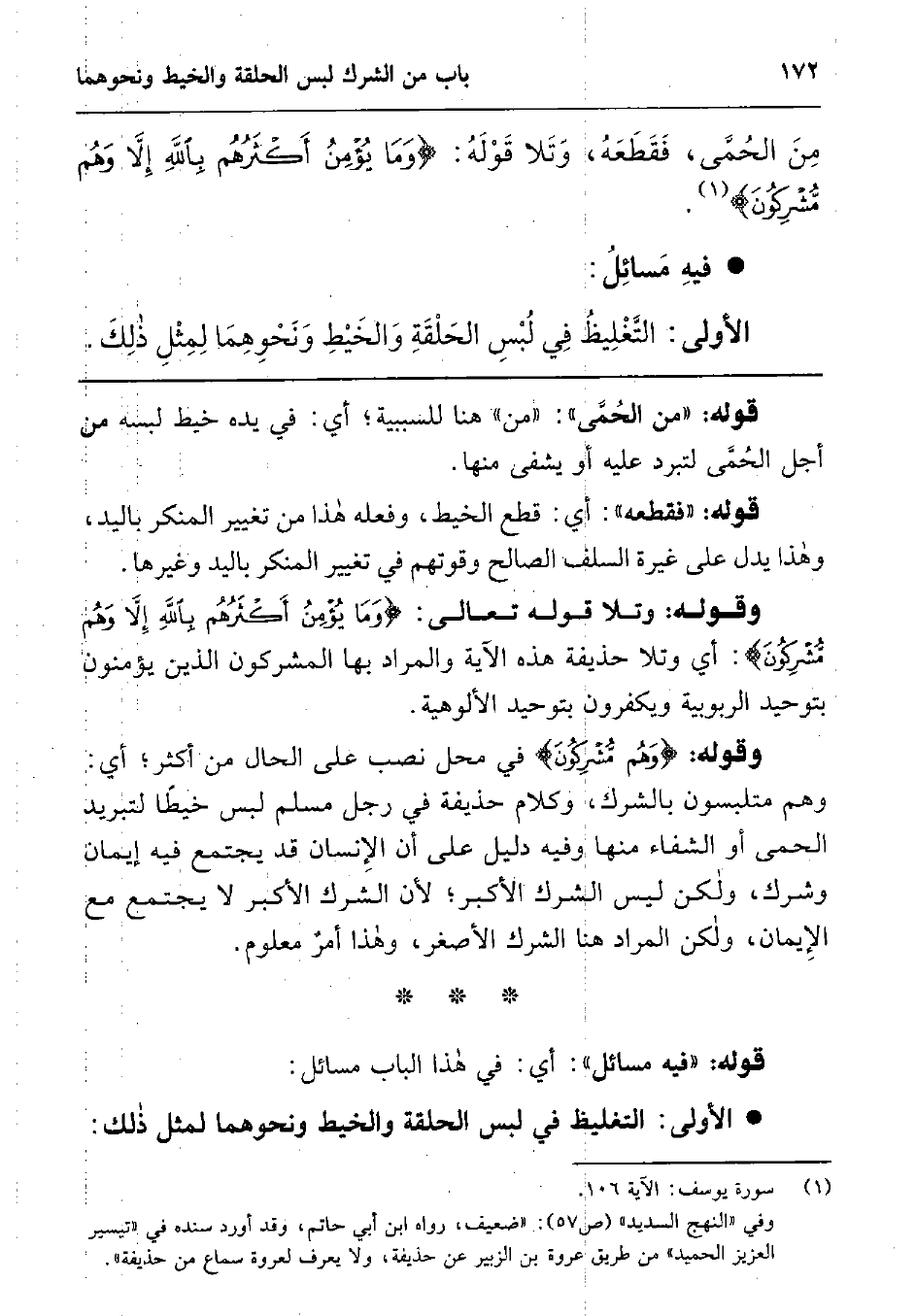 وقوله: وتلا قوله تعالى: {وَمَا يُؤْمِنُ أَكْثَرُهُمْ بِاللَّهِ إِلاَّ وَهُمْ مُشْرِكُونَ} 2 أي وتلا حذيفة هذه الآية3 والمراد بها المشركون الذين يؤمنون بتوحيد الربوبية ويكفرون بتوحيد الألوهية.