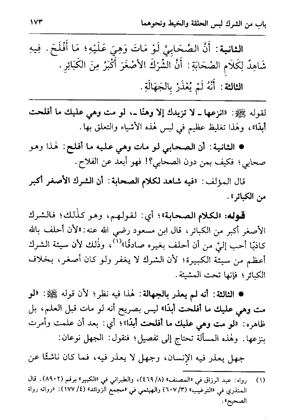 قوله: "لكلام الصحابة"; أي: لقولهم، وهو كذلك; فالشرك الأصغر أكبر من الكبائر، قال ابن مسعودرضي الله عنه" لأن أحلف بالله كاذبا أحب إلي من أن أحلف بغيره صادقا "2 وذلك لأن سيئة الشرك أعظم من سيئة الكبيرة; لأن الشرك لا يغفر ولو كان أصغر، بخلاف الكبائر; فإنها تحت المشيئة.