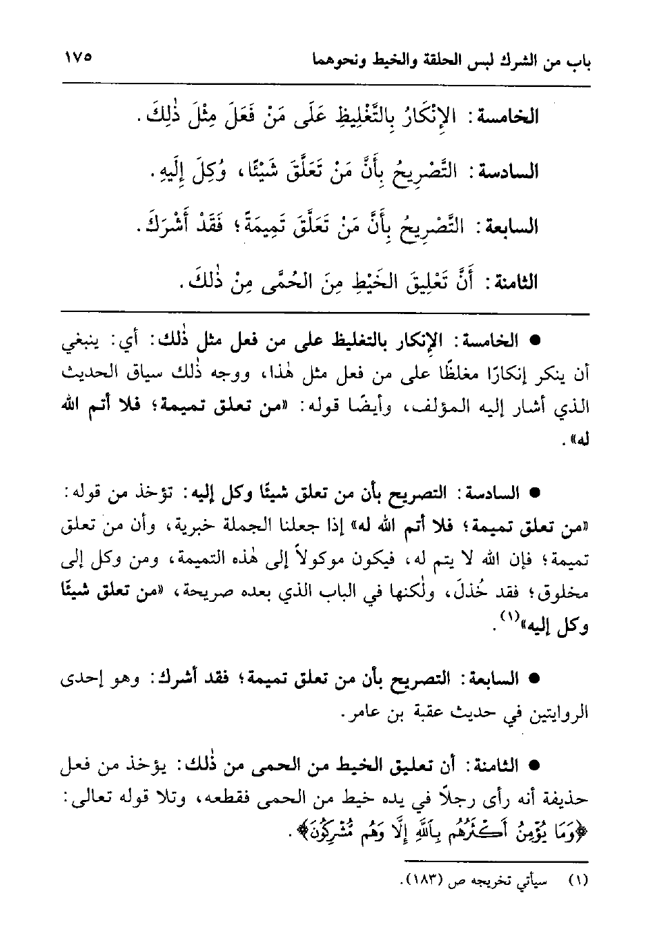 الخامسة: الإنكار بالتغليظ على من فعل مثل ذلك: أي: ينبغي أن ينكر إنكارا مغلظا على من فعل مثل هذا، ووجه ذلك سياق الحديث الذي أشار إليه المؤلف، وأيضا قوله ـ صلّى الله عليه وسلّم ـ: " من تعلق تميمة; فلا أتم الله له "1.