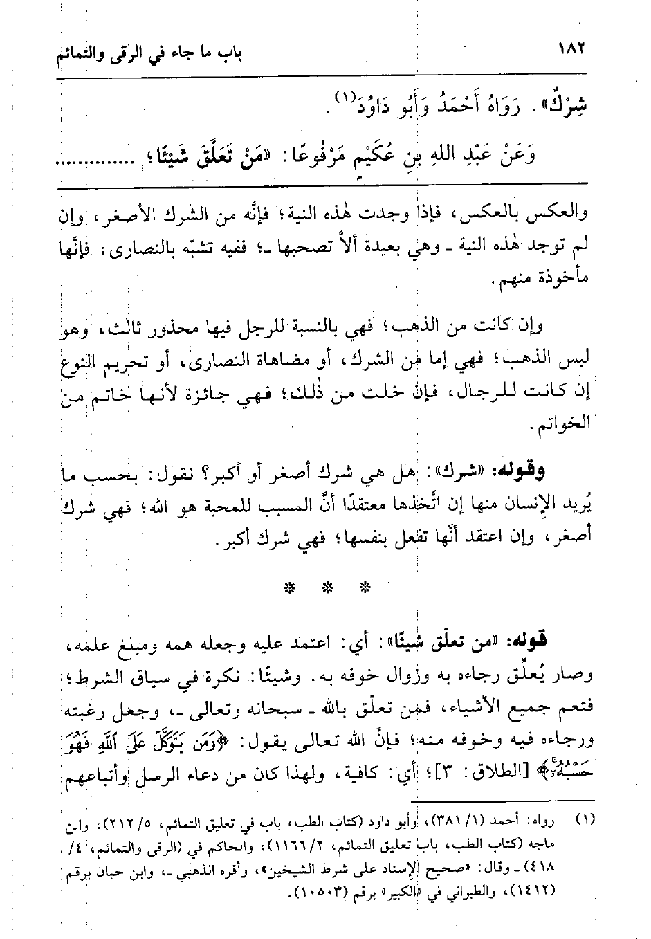1 رواه: أحمد (1/381) , وأبو داود (كتاب الطب, باب في تعليق التمائم, 5/212) , وابن ماجه (كتاب الطب, باب تعليق التمائم, 2/1166) , والحاكم في (الرقى والتمائم, 4/ 418) - وقال: "صحيح الإسناد على شرط الشيخين", وأقره الذهبي -, وابن حبان برقم (1412) , والطبراني في "الكبير" برقم (10503) .