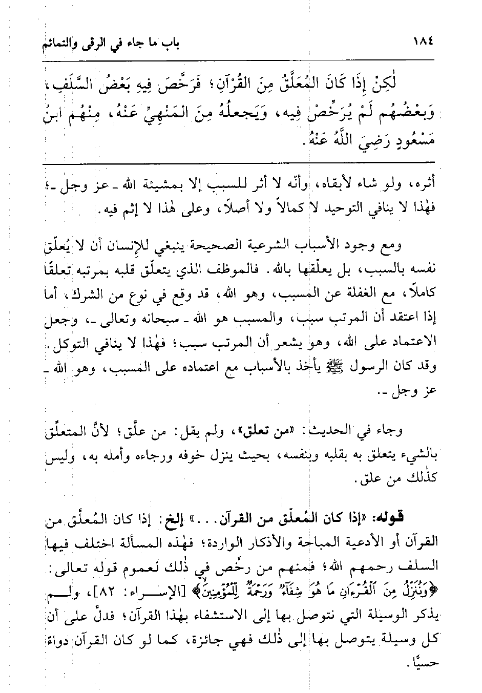 لكن إذا كان المعلق من القرآن; فرخص فيه بعض السلف، وبعضهم لم يرخص فيه، ويجعله من المنهي عنه، منهم ابن مسعود رضي الله عنه.