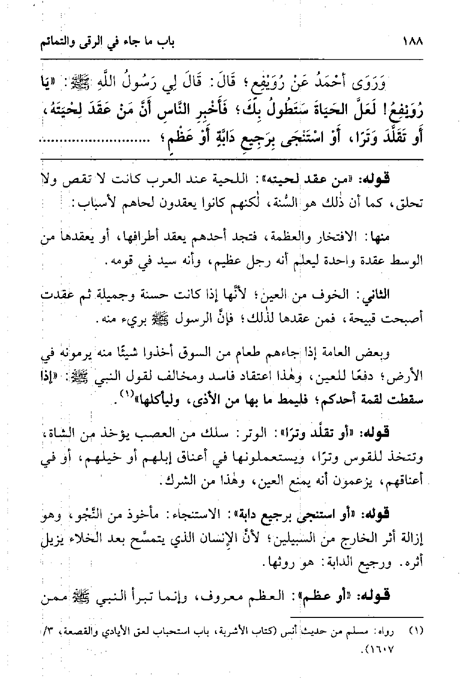 وروى أحمد عن رويفع; قال: قال لي رسول الله صلى الله عليه وسلم: " يا رويفع! لعل الحياة ستطول بك; فأخبر الناس أن من عقد لحيته، أو تقلد وترا، أو استنجى برجيع دابة أو عظم ;..........................................