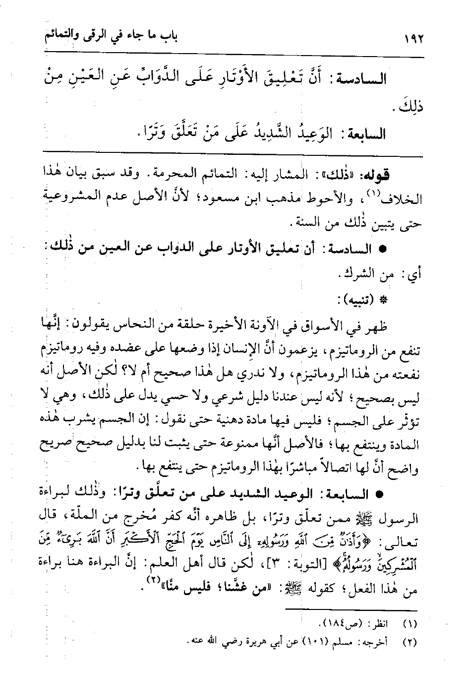 السابعة: الوعيد الشديد على من تعلق وترا: وذلك لبراءة الرسول صلى الله عليه وسلم ممن تعلق وترا، بل ظاهره أنه كفر مخرج من الملة، قال تعالى: {وَأَذَانٌ مِنَ اللَّهِ وَرَسُولِهِ إِلَى النَّاسِ يَوْمَ الْحَجِّ الأَكْبَرِ أَنَّ اللَّهَ بَرِيءٌ مِنَ الْمُشْرِكِينَ وَرَسُولُهُ} 2 لكن قال أهل العلم: إن البراءة هنا براءة من هذا الفعل; كقوله صلى الله عليه وسلم " من غشنا; فليس منا "3.