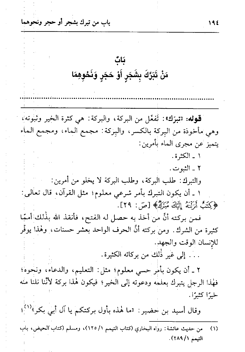 1. أن يكون التبرك بأمر شرعي معلوم; مثل القرآن، قال تعالى: {كِتَابٌ أَنْزَلْنَاهُ إِلَيْكَ مُبَارَكٌ} 1. فمن بركته أن من أخذ به حصل له الفتح، فأنقذ الله بذلك أمما كثيرة من الشرك، ومن بركته أن الحرف الواحد بعشر حسنات، وهذا يوفر للإنسان الوقت والجهد....، إلى غير ذلك من بركاته الكثيرة.